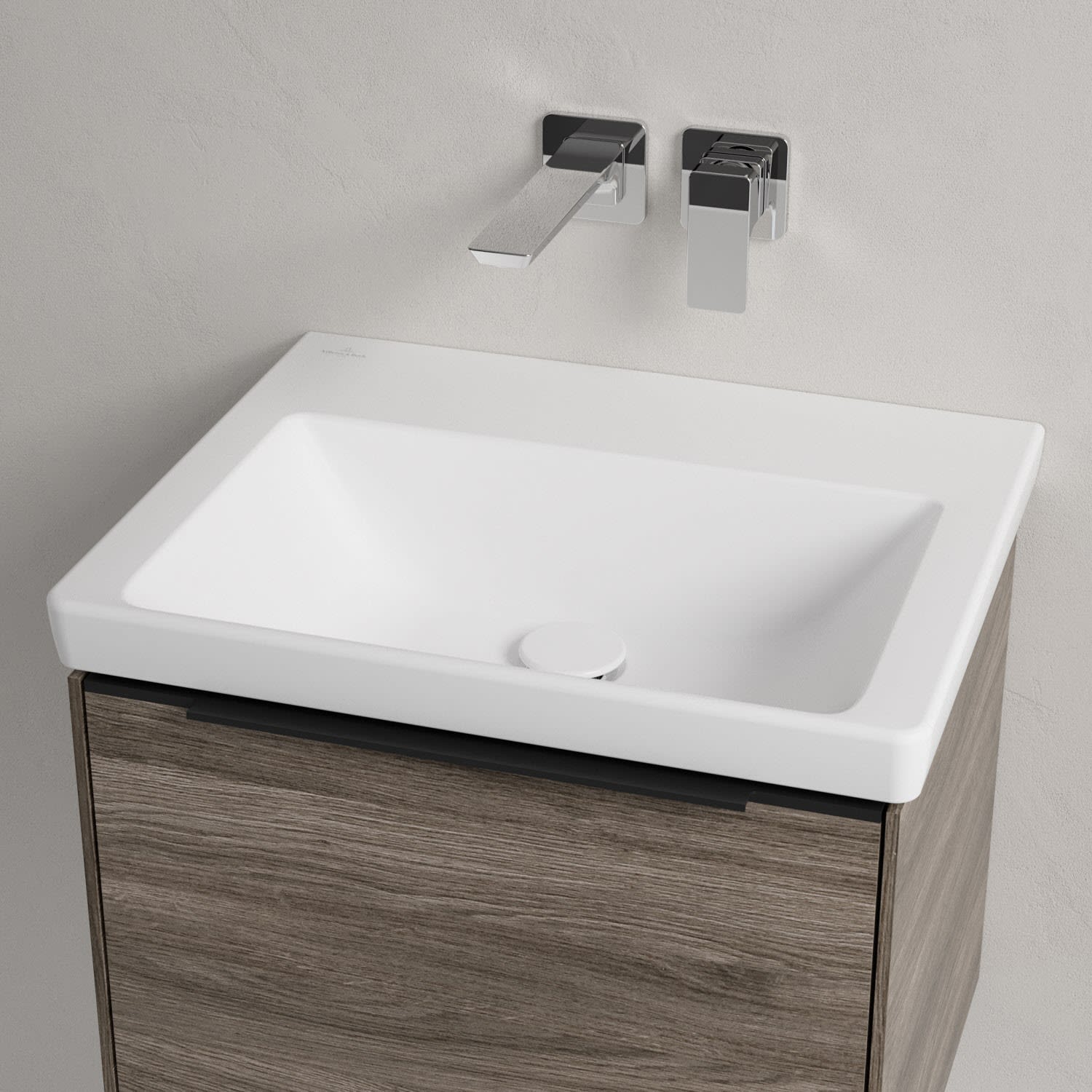Der rechteckige Schrankwaschtisch zeigt sich in gewohnt zeitlosem Design. Sein schmaler Rand sorgt nicht nur für einen modernen Look, sondern auch für ein noch größeres Becken. Mit seiner Tiefe erfüllt es alle Anforderungen des Alltags und bietet ausreichend Platz zum Hände waschen, Zähne putzen oder sogar für die Textilwäsche. Und auf der breiten Hahnlochbank findet sich genügend Ablagefläche für Seifenspender und andere Utensilien.