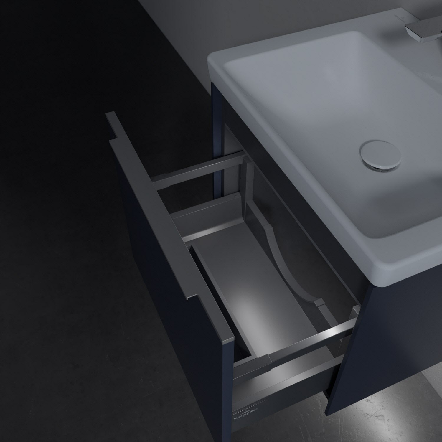 Der Waschtischunterschrank besticht durch gradliniges, zeitloses Design und großzügigen Stauraum. Eine voll ausziehbare Schublade mit rutschhemmendem Boden, Selbsteinzug-Funktion sowie einer integrierten kleinen Accessory-Box bietet Platz für Pflege- und Hygieneartikel. Front und Korpus sind hochwertig verarbeitet. Die dezente Griffleiste sorgt für einfache Handhabung und bildet einen besonderen Design-Akzent.