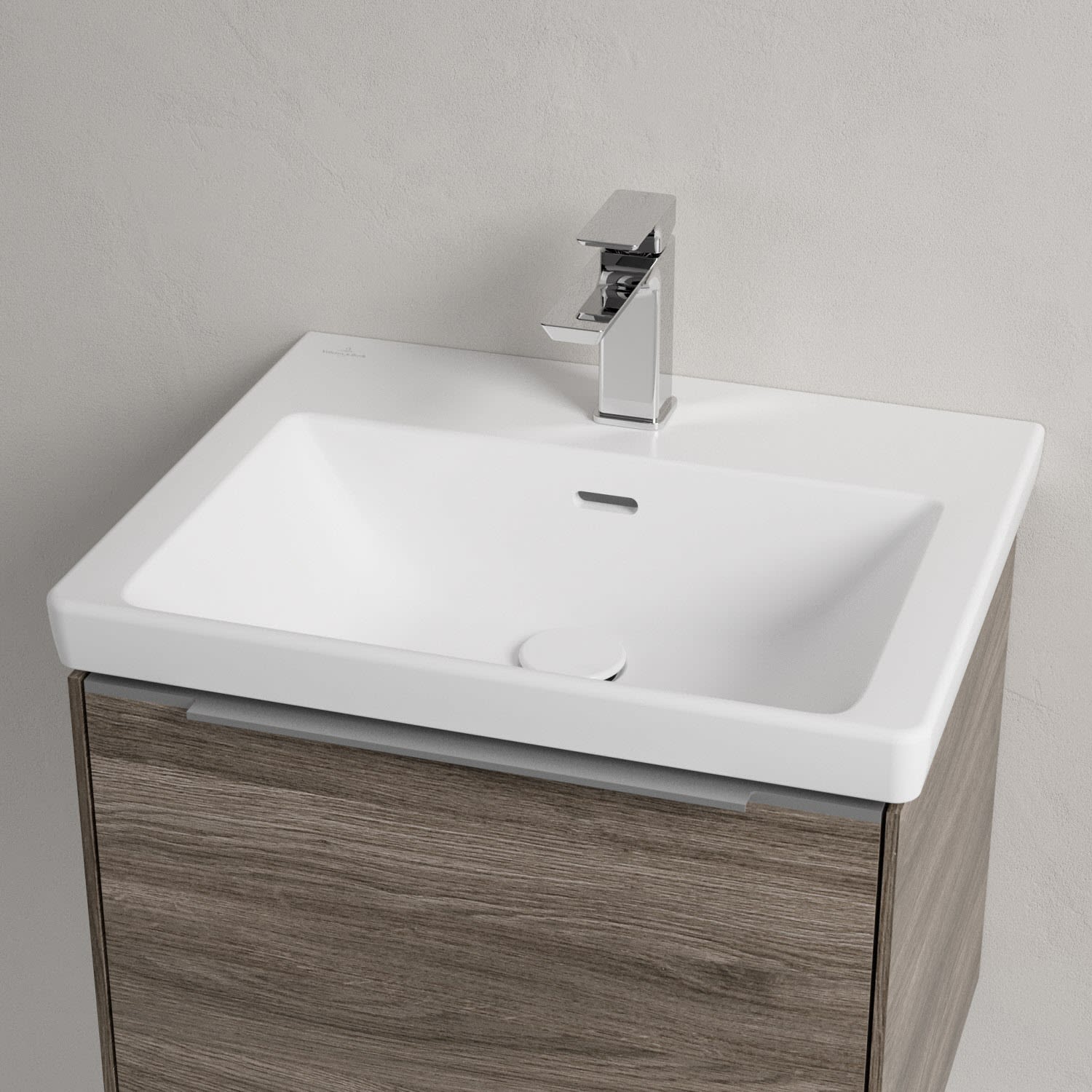 Der rechteckige Schrankwaschtisch zeigt sich in gewohnt zeitlosem Design. Sein schmaler Rand sorgt nicht nur für einen modernen Look, sondern auch für ein noch größeres Becken. Mit seiner Tiefe erfüllt es alle Anforderungen des Alltags und bietet ausreichend Platz zum Hände waschen, Zähne putzen oder sogar für die Textilwäsche. Und auf der breiten Hahnlochbank findet sich genügend Ablagefläche für Seifenspender und andere Utensilien.