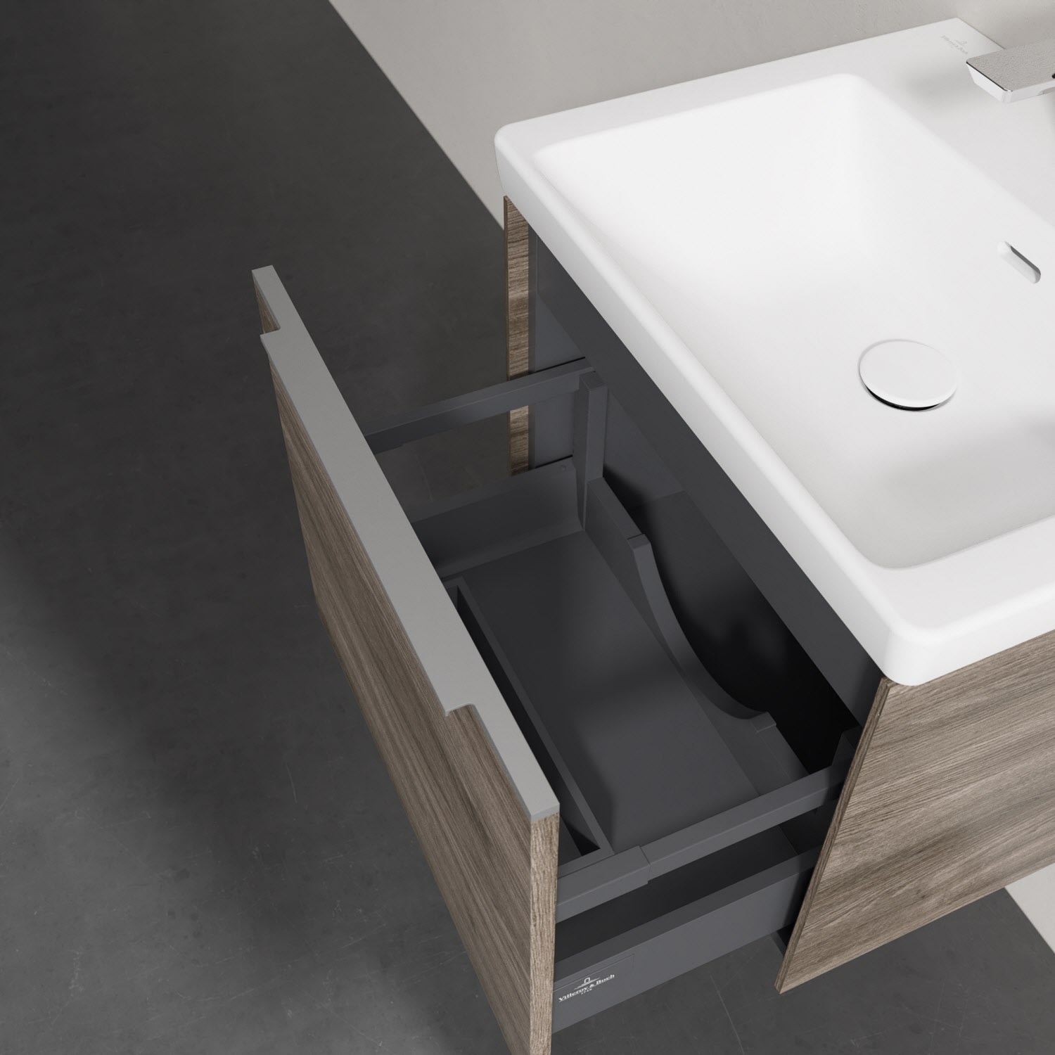 Der Waschtischunterschrank besticht durch gradliniges, zeitloses Design und großzügigen Stauraum. Eine voll ausziehbare Schublade mit rutschhemmendem Boden, Selbsteinzug-Funktion sowie einer integrierten kleinen Accessory-Box bietet Platz für Pflege- und Hygieneartikel. Front und Korpus sind hochwertig verarbeitet. Die dezente Griffleiste sorgt für einfache Handhabung und bildet einen besonderen Design-Akzent.