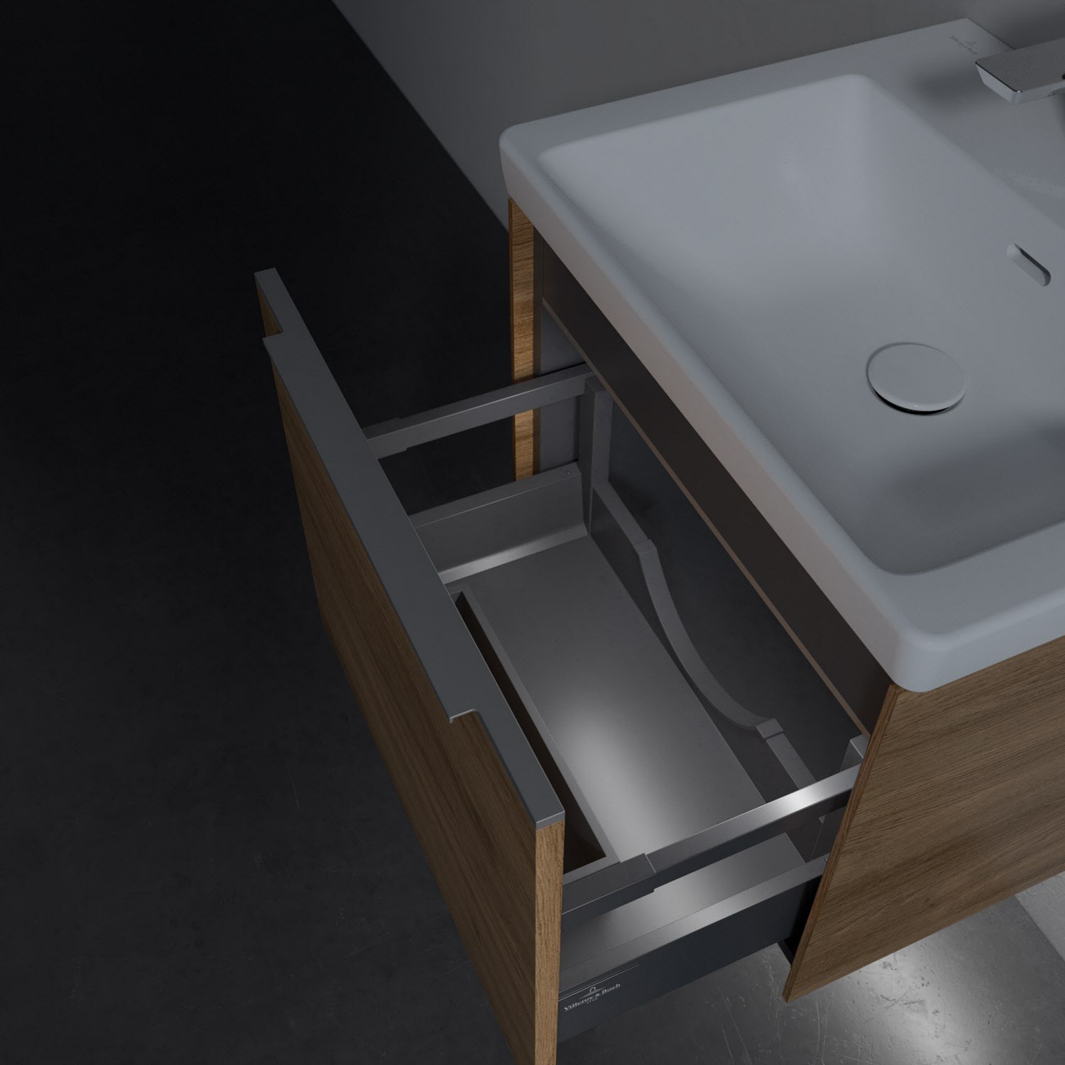 Der Waschtischunterschrank besticht durch gradliniges, zeitloses Design und großzügigen Stauraum. Eine voll ausziehbare Schublade mit rutschhemmendem Boden, Selbsteinzug-Funktion sowie einer integrierten kleinen Accessory-Box bietet Platz für Pflege- und Hygieneartikel. Front und Korpus sind hochwertig verarbeitet. Die dezente Griffleiste sorgt für einfache Handhabung und bildet einen besonderen Design-Akzent.