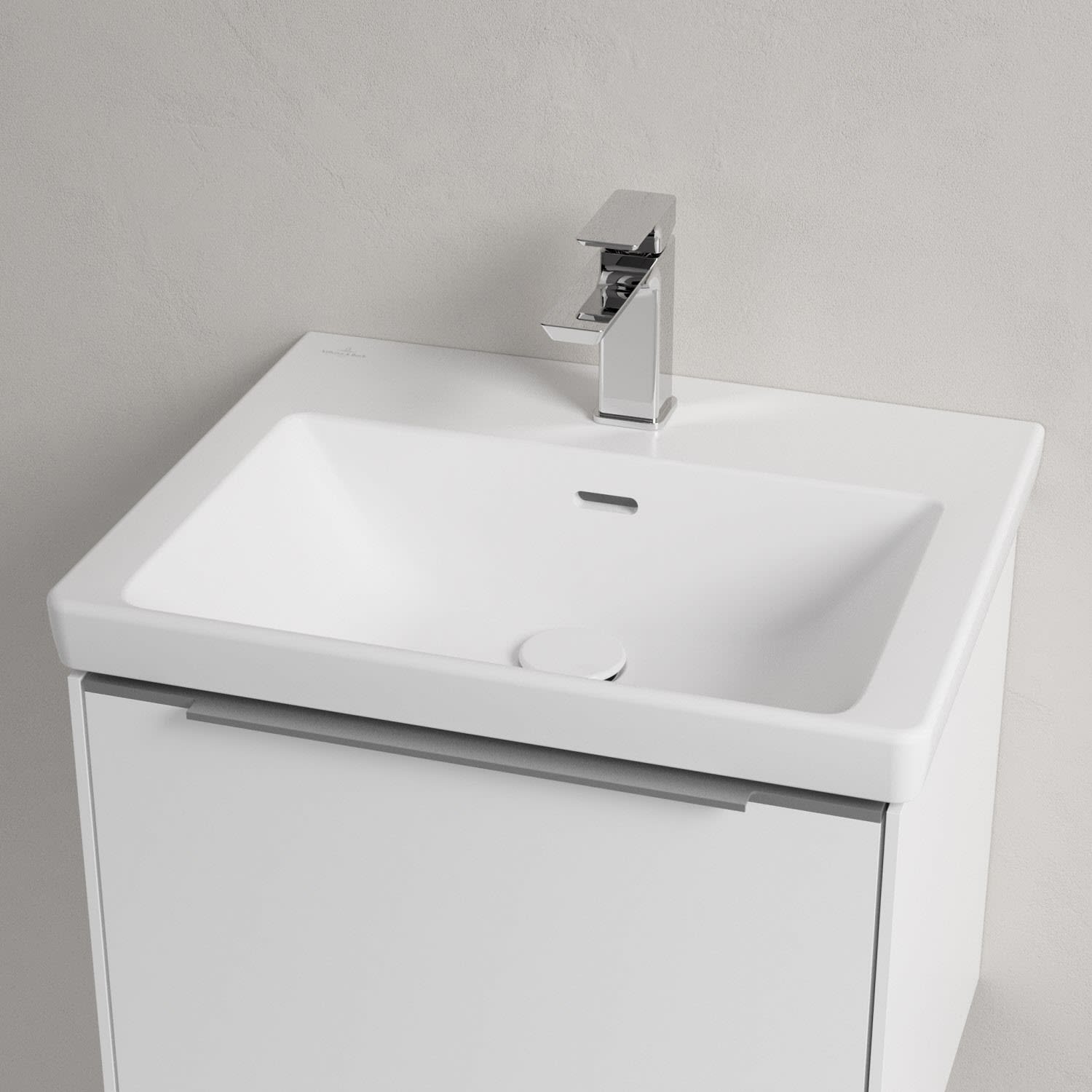 Der rechteckige Schrankwaschtisch zeigt sich in gewohnt zeitlosem Design. Sein schmaler Rand sorgt nicht nur für einen modernen Look, sondern auch für ein noch größeres Becken. Mit seiner Tiefe erfüllt es alle Anforderungen des Alltags und bietet ausreichend Platz zum Hände waschen, Zähne putzen oder sogar für die Textilwäsche. Und auf der breiten Hahnlochbank findet sich genügend Ablagefläche für Seifenspender und andere Utensilien.
