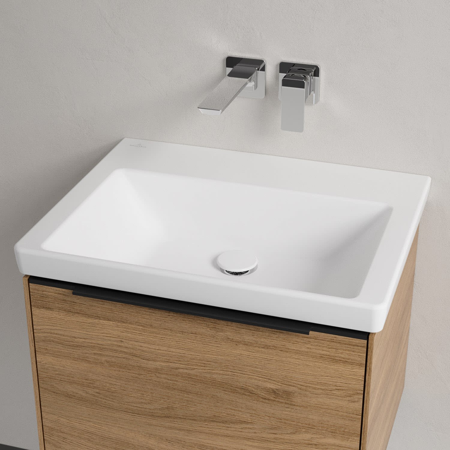 Der rechteckige Schrankwaschtisch zeigt sich in gewohnt zeitlosem Design. Sein schmaler Rand sorgt nicht nur für einen modernen Look, sondern auch für ein noch größeres Becken. Mit seiner Tiefe erfüllt es alle Anforderungen des Alltags und bietet ausreichend Platz zum Hände waschen, Zähne putzen oder sogar für die Textilwäsche. Und auf der breiten Hahnlochbank findet sich genügend Ablagefläche für Seifenspender und andere Utensilien.