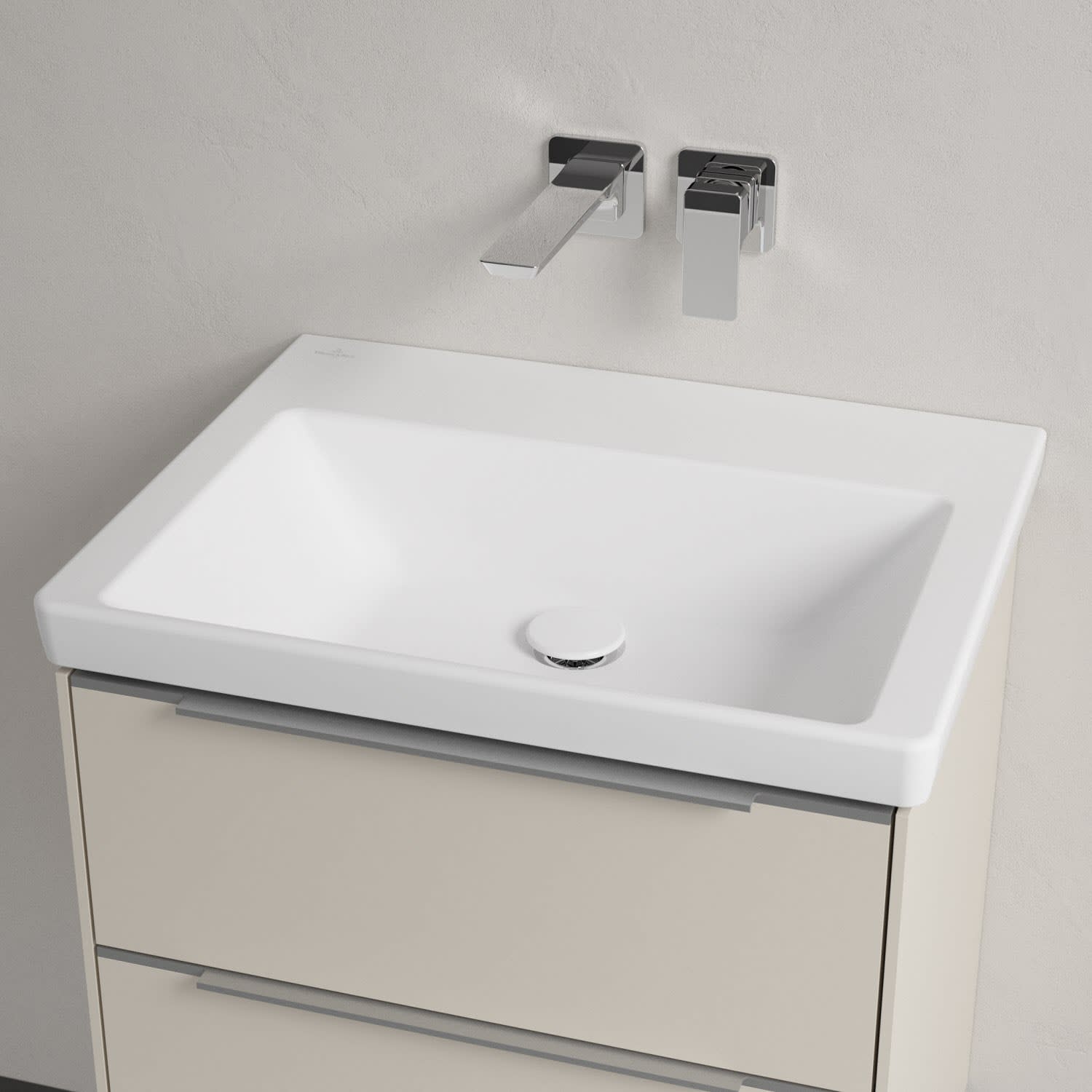 Der rechteckige Schrankwaschtisch zeigt sich in gewohnt zeitlosem Design. Sein schmaler Rand sorgt nicht nur für einen modernen Look, sondern auch für ein noch größeres Becken. Mit seiner Tiefe erfüllt es alle Anforderungen des Alltags und bietet ausreichend Platz zum Hände waschen, Zähne putzen oder sogar für die Textilwäsche. Und auf der breiten Hahnlochbank findet sich genügend Ablagefläche für Seifenspender und andere Utensilien.