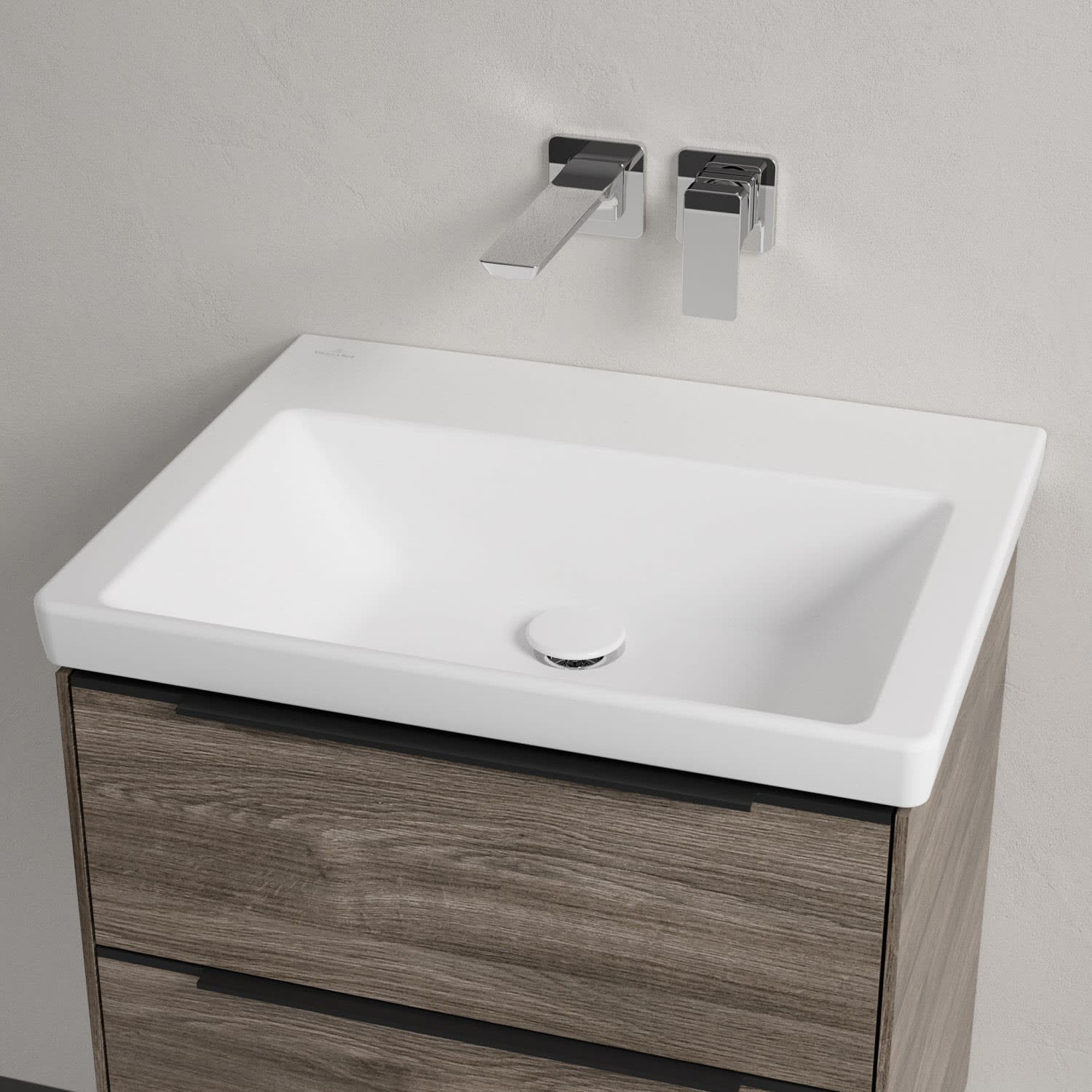 Der rechteckige Schrankwaschtisch zeigt sich in gewohnt zeitlosem Design. Sein schmaler Rand sorgt nicht nur für einen modernen Look, sondern auch für ein noch größeres Becken. Mit seiner Tiefe erfüllt es alle Anforderungen des Alltags und bietet ausreichend Platz zum Hände waschen, Zähne putzen oder sogar für die Textilwäsche. Und auf der breiten Hahnlochbank findet sich genügend Ablagefläche für Seifenspender und andere Utensilien.