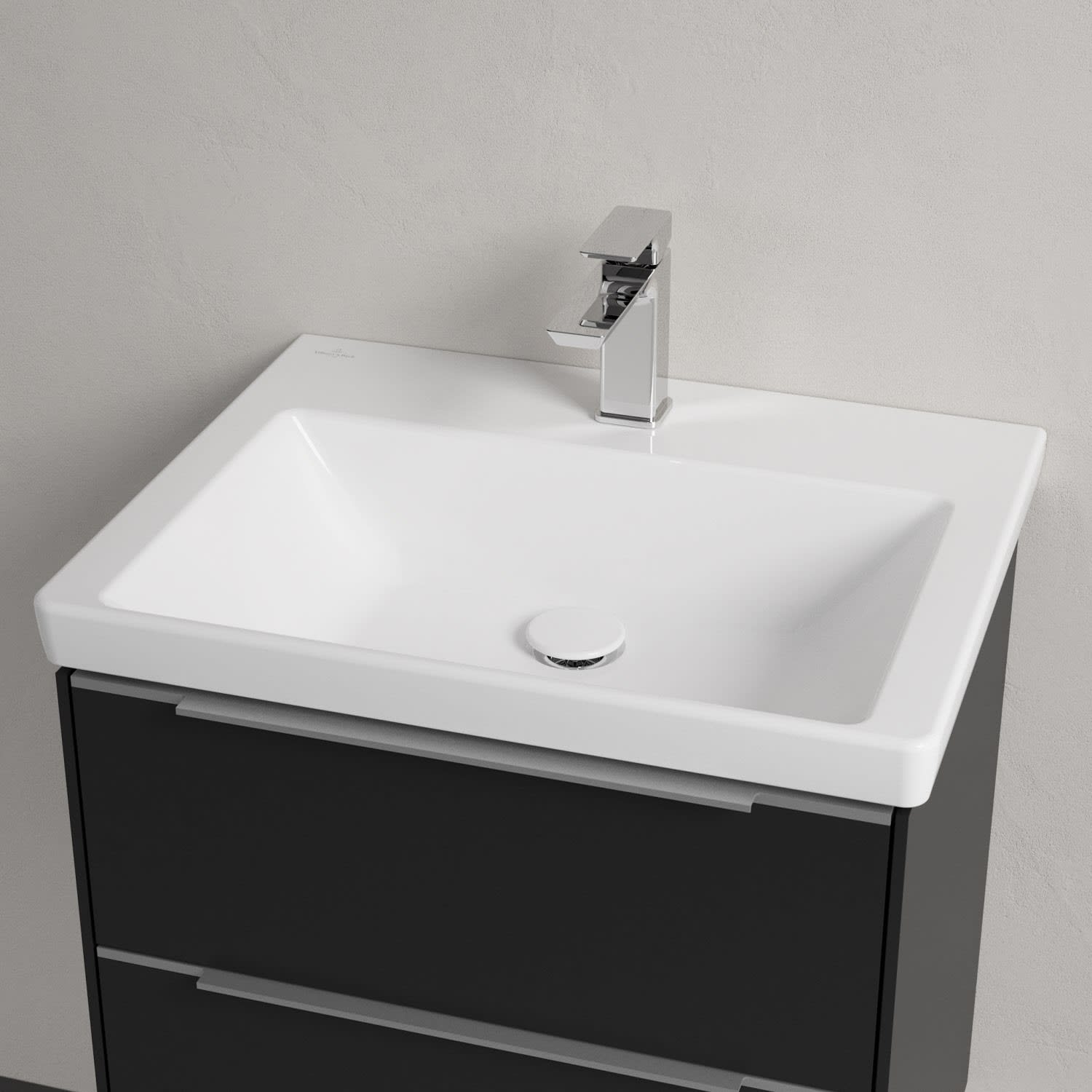 Der rechteckige Schrankwaschtisch zeigt sich in gewohnt zeitlosem Design. Sein schmaler Rand sorgt nicht nur für einen modernen Look, sondern auch für ein noch größeres Becken. Mit seiner Tiefe erfüllt es alle Anforderungen des Alltags und bietet ausreichend Platz zum Hände waschen, Zähne putzen oder sogar für die Textilwäsche. Und auf der breiten Hahnlochbank findet sich genügend Ablagefläche für Seifenspender und andere Utensilien.
