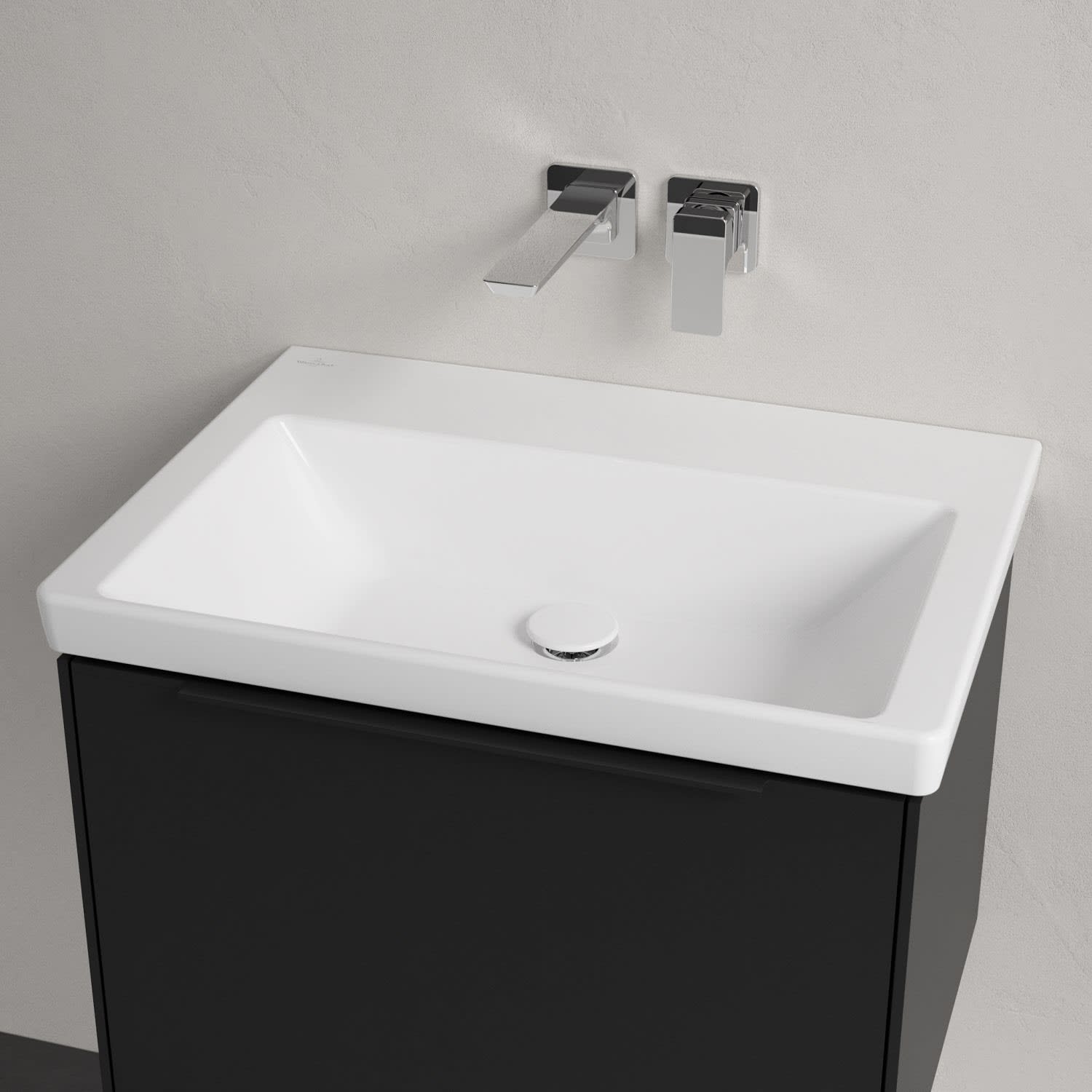 Der rechteckige Schrankwaschtisch zeigt sich in gewohnt zeitlosem Design. Sein schmaler Rand sorgt nicht nur für einen modernen Look, sondern auch für ein noch größeres Becken. Mit seiner Tiefe erfüllt es alle Anforderungen des Alltags und bietet ausreichend Platz zum Hände waschen, Zähne putzen oder sogar für die Textilwäsche. Und auf der breiten Hahnlochbank findet sich genügend Ablagefläche für Seifenspender und andere Utensilien.