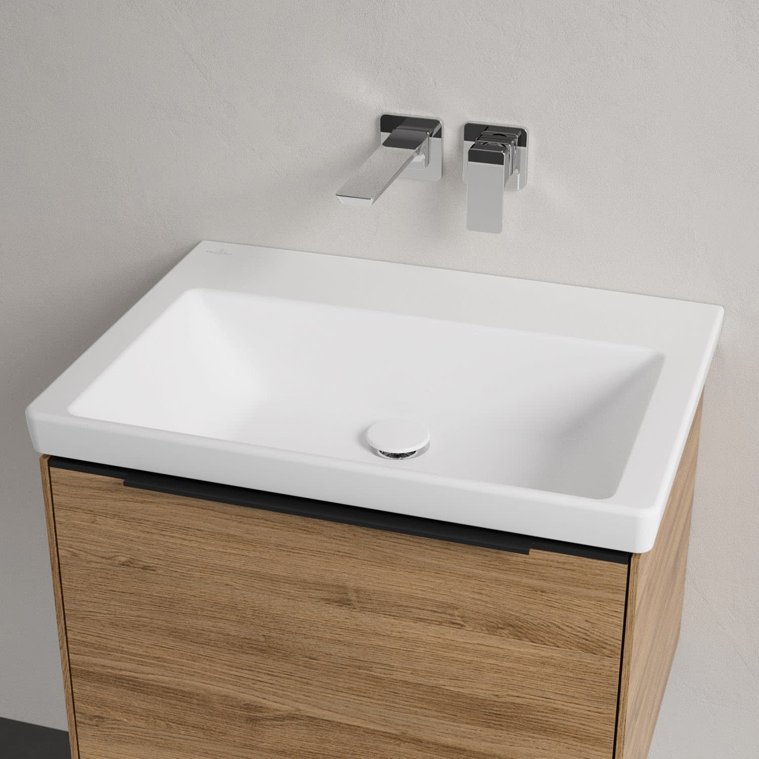 Der rechteckige Schrankwaschtisch zeigt sich in gewohnt zeitlosem Design. Sein schmaler Rand sorgt nicht nur für einen modernen Look, sondern auch für ein noch größeres Becken. Mit seiner Tiefe erfüllt es alle Anforderungen des Alltags und bietet ausreichend Platz zum Hände waschen, Zähne putzen oder sogar für die Textilwäsche. Und auf der breiten Hahnlochbank findet sich genügend Ablagefläche für Seifenspender und andere Utensilien.