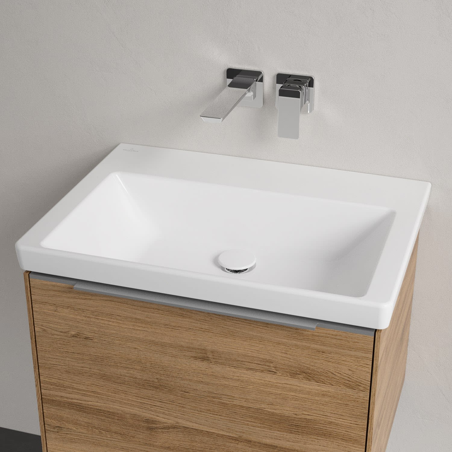 Der rechteckige Schrankwaschtisch zeigt sich in gewohnt zeitlosem Design. Sein schmaler Rand sorgt nicht nur für einen modernen Look, sondern auch für ein noch größeres Becken. Mit seiner Tiefe erfüllt es alle Anforderungen des Alltags und bietet ausreichend Platz zum Hände waschen, Zähne putzen oder sogar für die Textilwäsche. Und auf der breiten Hahnlochbank findet sich genügend Ablagefläche für Seifenspender und andere Utensilien.