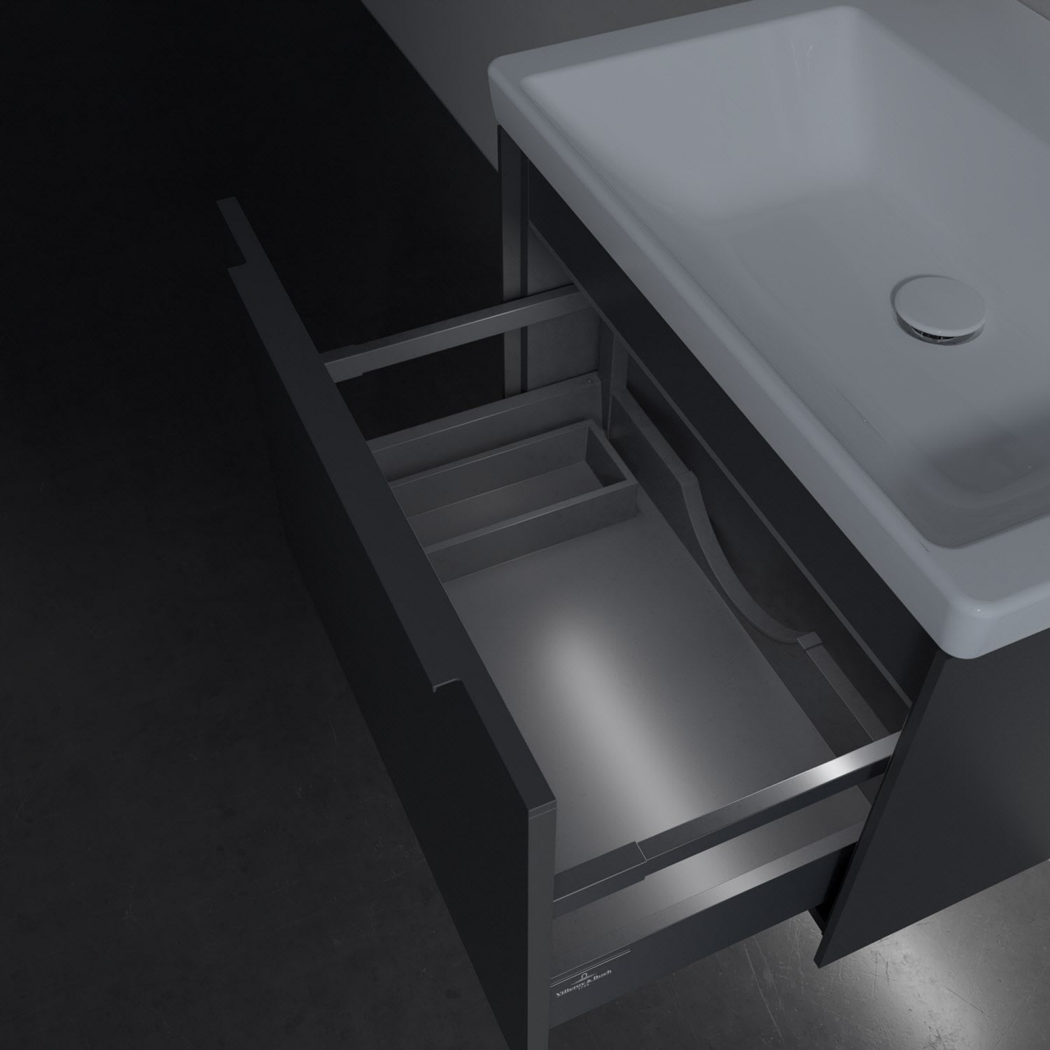 Der Waschtischunterschrank besticht durch gradliniges, zeitloses Design und großzügigen Stauraum. Eine voll ausziehbare Schublade mit rutschhemmendem Boden, Selbsteinzug-Funktion sowie einer integrierten kleinen Accessory-Box bietet Platz für Pflege- und Hygieneartikel. Front und Korpus sind hochwertig verarbeitet. Die dezente Griffleiste sorgt für einfache Handhabung und bildet einen besonderen Design-Akzent.