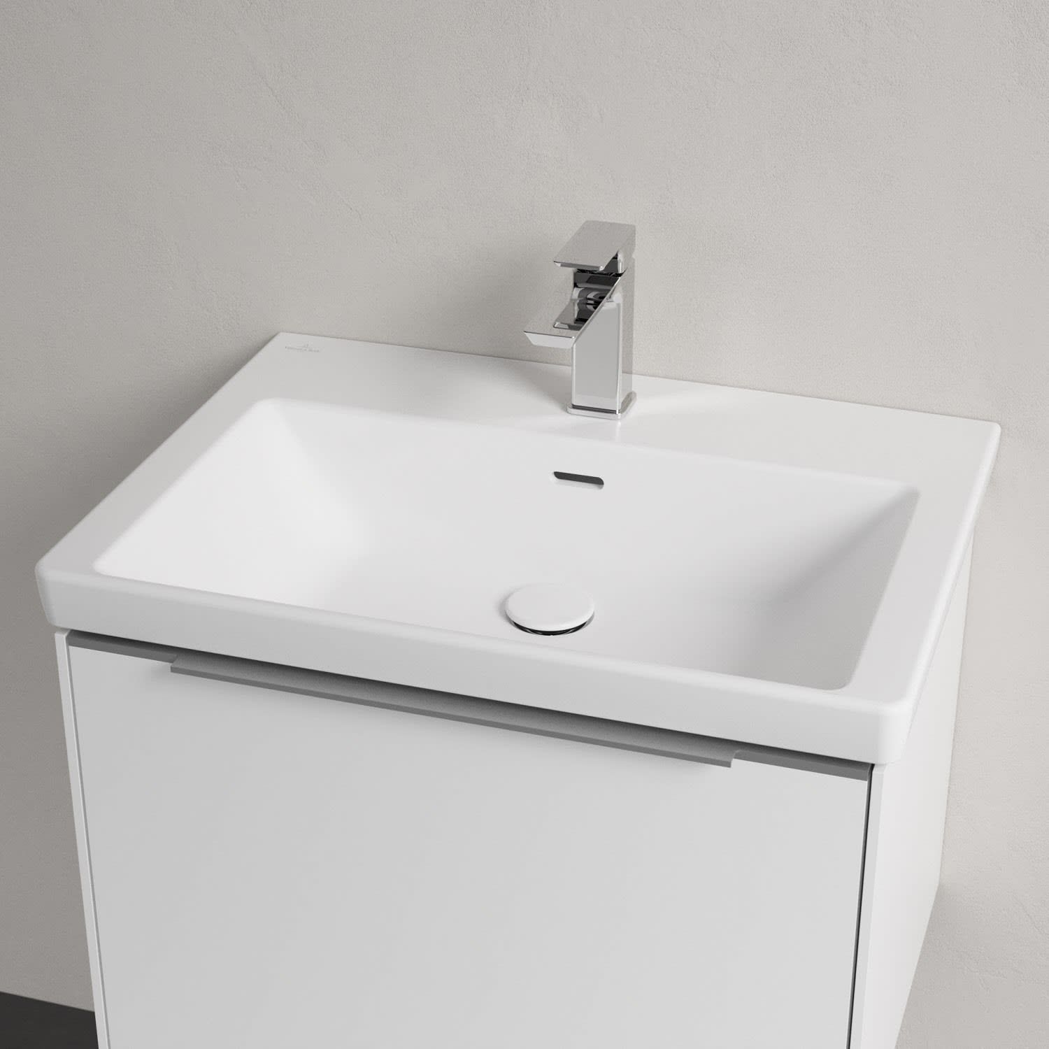 Der rechteckige Schrankwaschtisch zeigt sich in gewohnt zeitlosem Design. Sein schmaler Rand sorgt nicht nur für einen modernen Look, sondern auch für ein noch größeres Becken. Mit seiner Tiefe erfüllt es alle Anforderungen des Alltags und bietet ausreichend Platz zum Hände waschen, Zähne putzen oder sogar für die Textilwäsche. Und auf der breiten Hahnlochbank findet sich genügend Ablagefläche für Seifenspender und andere Utensilien.
