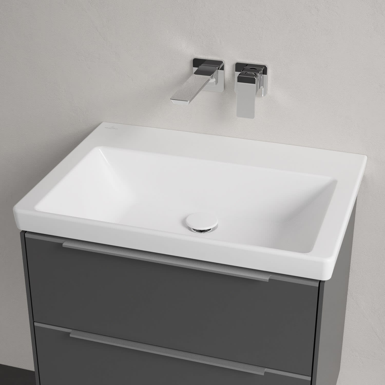 Der rechteckige Schrankwaschtisch zeigt sich in gewohnt zeitlosem Design. Sein schmaler Rand sorgt nicht nur für einen modernen Look, sondern auch für ein noch größeres Becken. Mit seiner Tiefe erfüllt es alle Anforderungen des Alltags und bietet ausreichend Platz zum Hände waschen, Zähne putzen oder sogar für die Textilwäsche. Und auf der breiten Hahnlochbank findet sich genügend Ablagefläche für Seifenspender und andere Utensilien.
