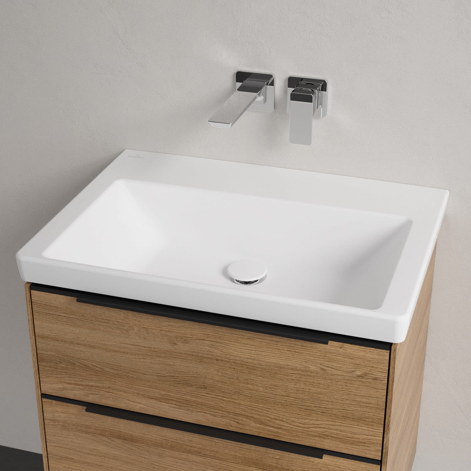 Der rechteckige Schrankwaschtisch zeigt sich in gewohnt zeitlosem Design. Sein schmaler Rand sorgt nicht nur für einen modernen Look, sondern auch für ein noch größeres Becken. Mit seiner Tiefe erfüllt es alle Anforderungen des Alltags und bietet ausreichend Platz zum Hände waschen, Zähne putzen oder sogar für die Textilwäsche. Und auf der breiten Hahnlochbank findet sich genügend Ablagefläche für Seifenspender und andere Utensilien.