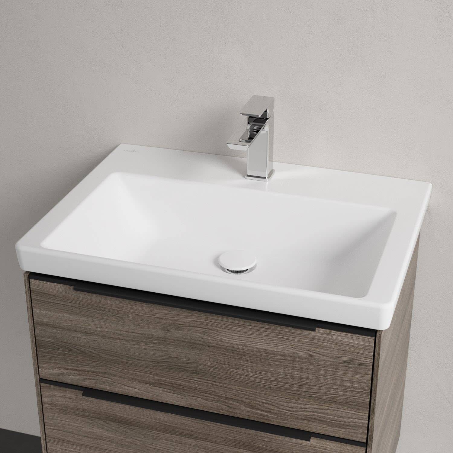 Der rechteckige Schrankwaschtisch zeigt sich in gewohnt zeitlosem Design. Sein schmaler Rand sorgt nicht nur für einen modernen Look, sondern auch für ein noch größeres Becken. Mit seiner Tiefe erfüllt es alle Anforderungen des Alltags und bietet ausreichend Platz zum Hände waschen, Zähne putzen oder sogar für die Textilwäsche. Und auf der breiten Hahnlochbank findet sich genügend Ablagefläche für Seifenspender und andere Utensilien.