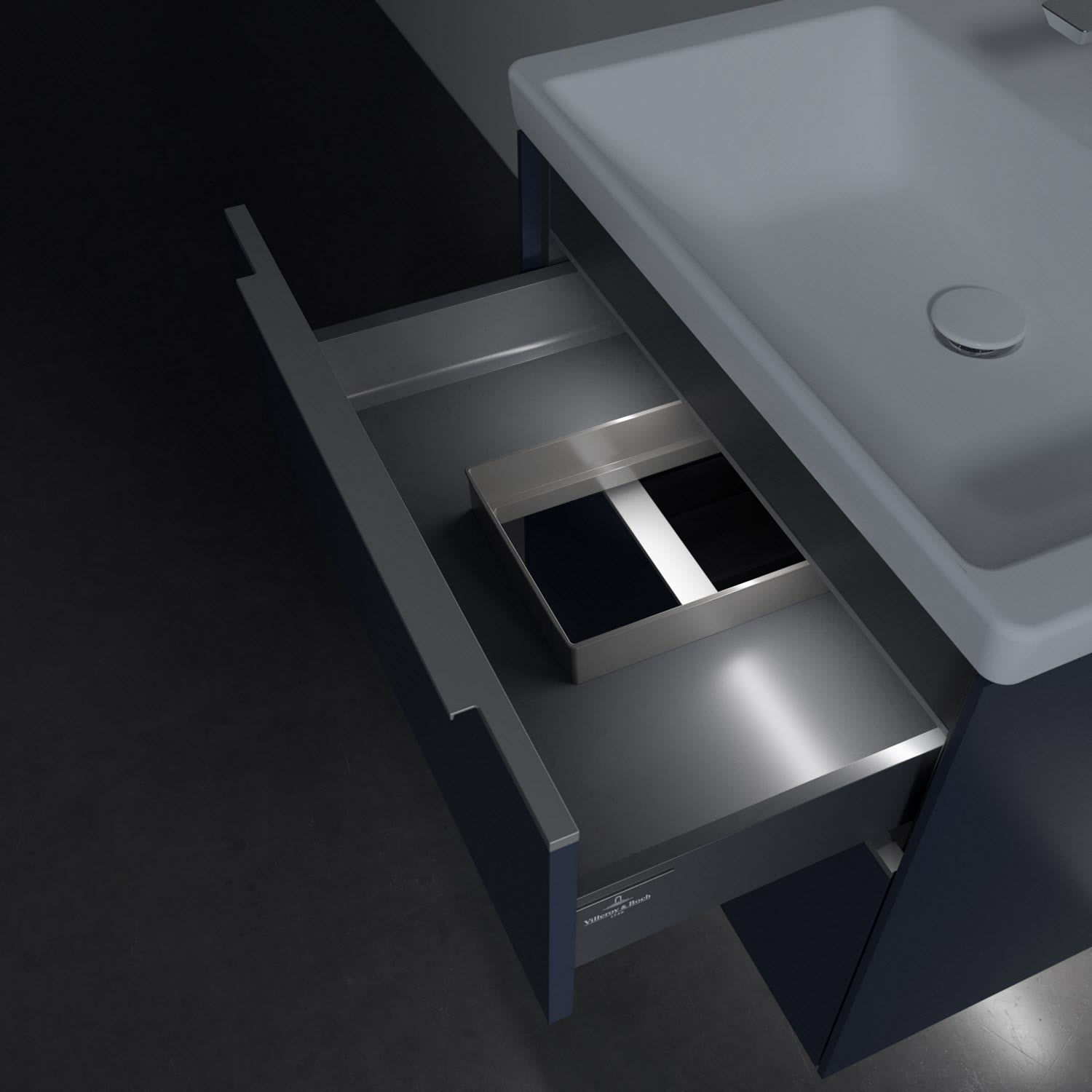 Der Waschtischunterschrank besticht durch gradliniges, zeitloses Design und großzügigen Stauraum. Eine voll ausziehbare Schublade mit rutschhemmendem Boden, Selbsteinzug-Funktion sowie einer integrierten kleinen Accessory-Box bietet Platz für Pflege- und Hygieneartikel. Front und Korpus sind hochwertig verarbeitet. Die dezente Griffleiste sorgt für einfache Handhabung und bildet einen besonderen Design-Akzent.
