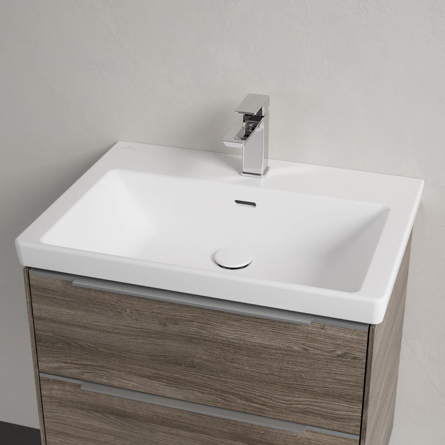 Der rechteckige Schrankwaschtisch zeigt sich in gewohnt zeitlosem Design. Sein schmaler Rand sorgt nicht nur für einen modernen Look, sondern auch für ein noch größeres Becken. Mit seiner Tiefe erfüllt es alle Anforderungen des Alltags und bietet ausreichend Platz zum Hände waschen, Zähne putzen oder sogar für die Textilwäsche. Und auf der breiten Hahnlochbank findet sich genügend Ablagefläche für Seifenspender und andere Utensilien.