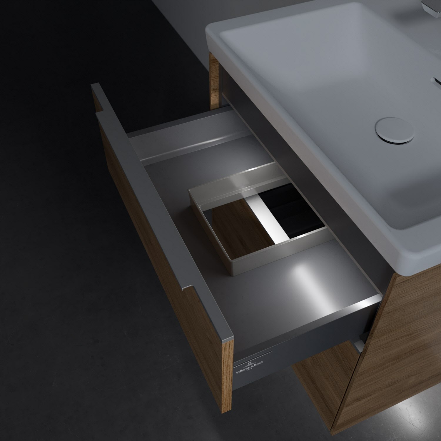 Der Waschtischunterschrank besticht durch gradliniges, zeitloses Design und großzügigen Stauraum. Eine voll ausziehbare Schublade mit rutschhemmendem Boden, Selbsteinzug-Funktion sowie einer integrierten kleinen Accessory-Box bietet Platz für Pflege- und Hygieneartikel. Front und Korpus sind hochwertig verarbeitet. Die dezente Griffleiste sorgt für einfache Handhabung und bildet einen besonderen Design-Akzent.