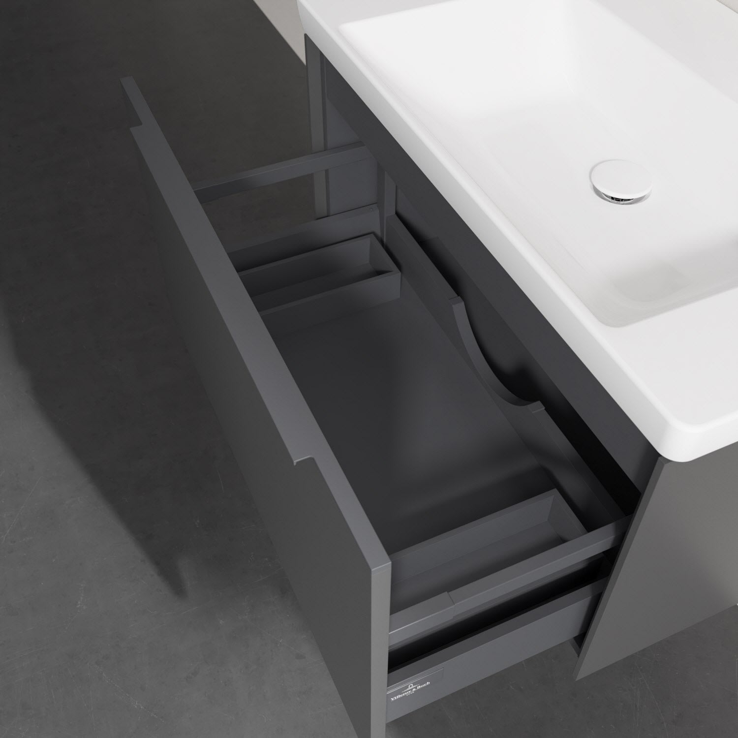 Der Waschtischunterschrank besticht durch gradliniges, zeitloses Design und großzügigen Stauraum. Eine voll ausziehbare Schublade mit rutschhemmendem Boden, Selbsteinzug-Funktion sowie zwei integrierten kleinen Accessory-Boxen bietet Platz für Pflege- und Hygieneartikel. Front und Korpus sind hochwertig verarbeitet. Die dezente Griffleiste sorgt für einfache Handhabung und bildet einen besonderen Design-Akzent.
