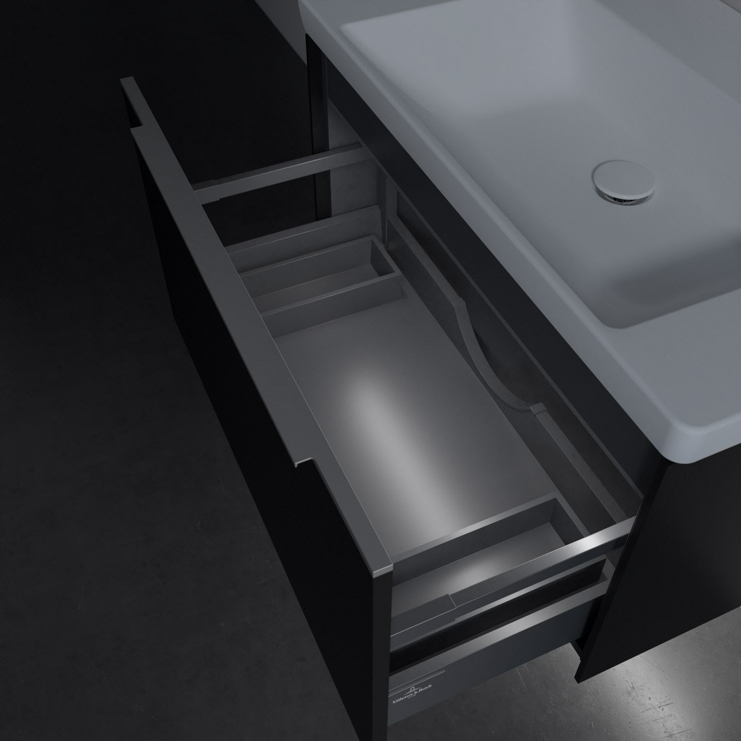Der Waschtischunterschrank besticht durch gradliniges, zeitloses Design und großzügigen Stauraum. Eine voll ausziehbare Schublade mit rutschhemmendem Boden, Selbsteinzug-Funktion sowie zwei integrierten kleinen Accessory-Boxen bietet Platz für Pflege- und Hygieneartikel. Front und Korpus sind hochwertig verarbeitet. Die dezente Griffleiste sorgt für einfache Handhabung und bildet einen besonderen Design-Akzent.