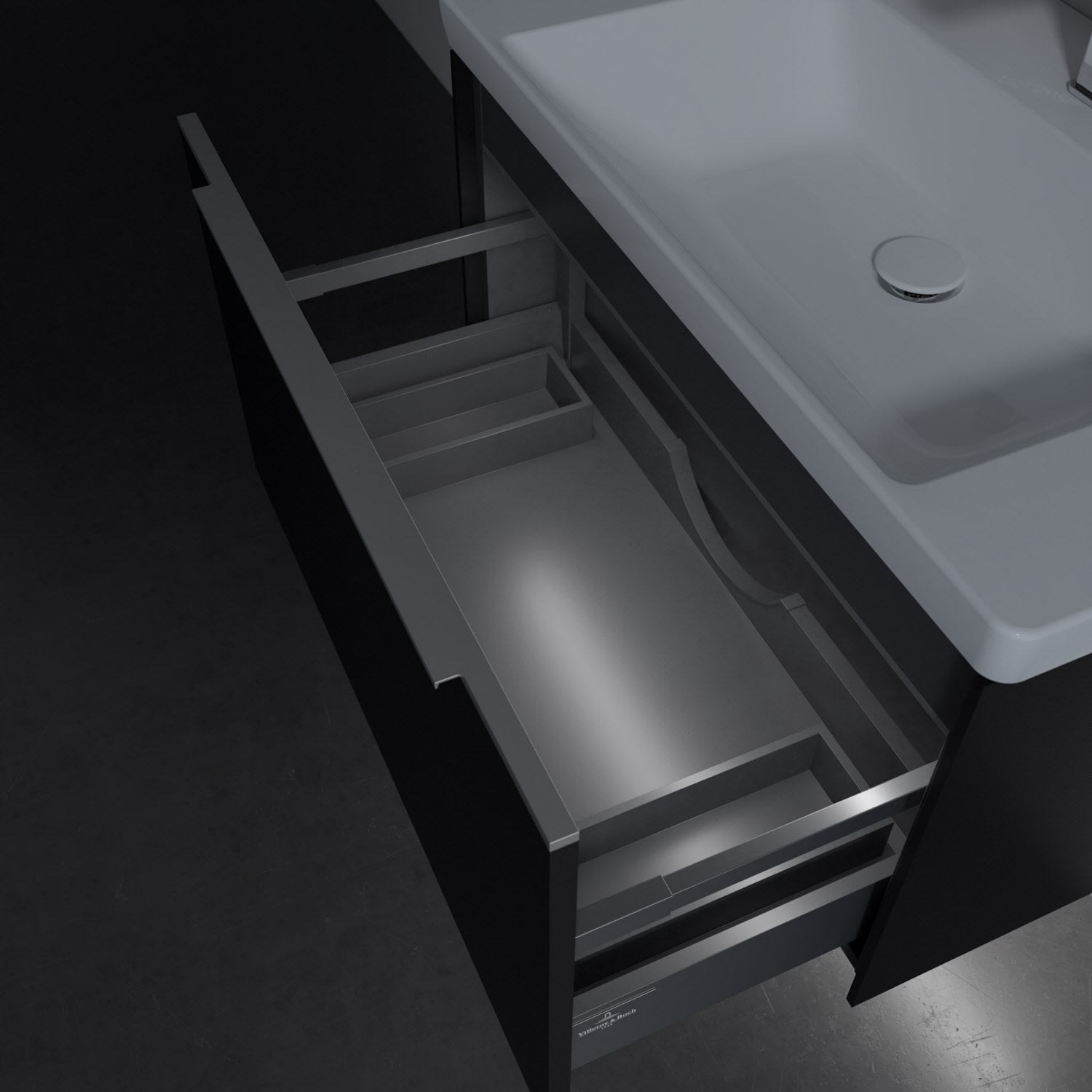 Der Waschtischunterschrank besticht durch gradliniges, zeitloses Design und großzügigen Stauraum. Eine voll ausziehbare Schublade mit rutschhemmendem Boden, Selbsteinzug-Funktion sowie zwei integrierten kleinen Accessory-Boxen bietet Platz für Pflege- und Hygieneartikel. Front und Korpus sind hochwertig verarbeitet. Die dezente Griffleiste sorgt für einfache Handhabung und bildet einen besonderen Design-Akzent.