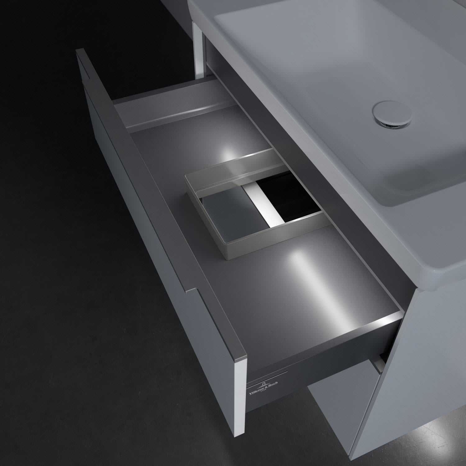 Der Waschtischunterschrank besticht durch gradliniges, zeitloses Design und großzügigen Stauraum. Eine voll ausziehbare Schublade mit rutschhemmendem Boden, Selbsteinzug-Funktion sowie zwei integrierten kleinen Accessory-Boxen bietet Platz für Pflege- und Hygieneartikel. Front und Korpus sind hochwertig verarbeitet. Die dezente Griffleiste sorgt für einfache Handhabung und bildet einen besonderen Design-Akzent.