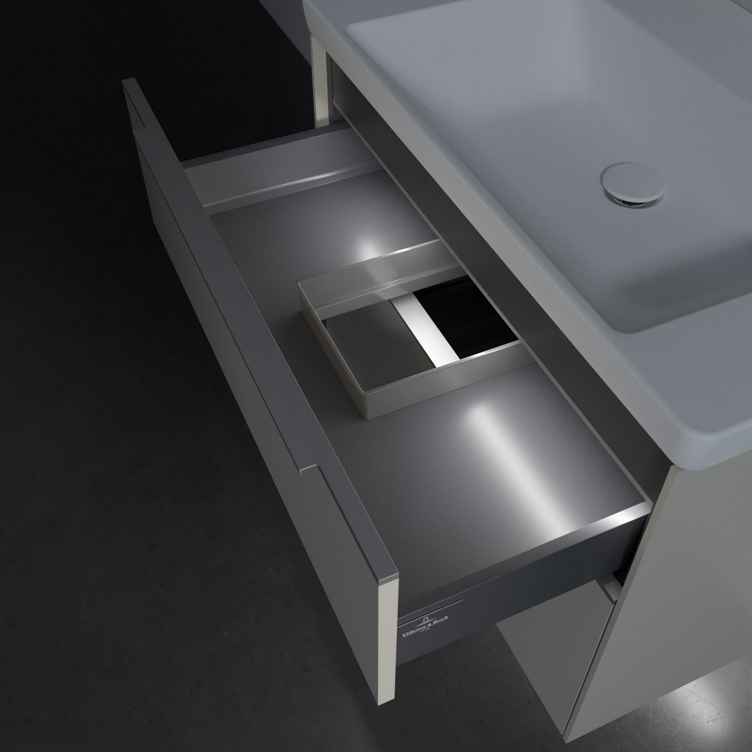 Der Waschtischunterschrank besticht durch gradliniges, zeitloses Design und großzügigen Stauraum. Eine voll ausziehbare Schublade mit rutschhemmendem Boden, Selbsteinzug-Funktion sowie zwei integrierten kleinen Accessory-Boxen bietet Platz für Pflege- und Hygieneartikel. Front und Korpus sind hochwertig verarbeitet. Die dezente Griffleiste sorgt für einfache Handhabung und bildet einen besonderen Design-Akzent.