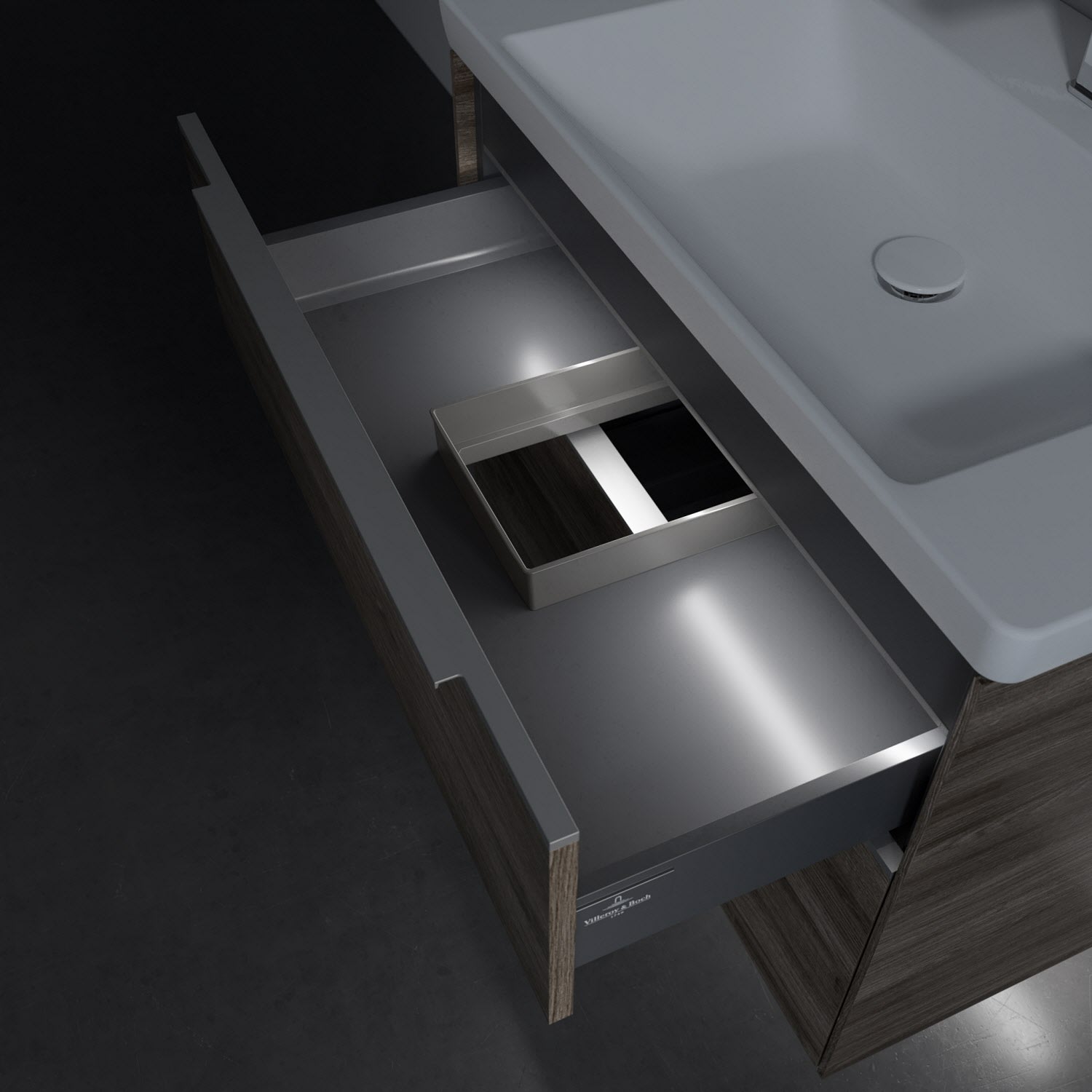 Der Waschtischunterschrank besticht durch gradliniges, zeitloses Design und großzügigen Stauraum. Eine voll ausziehbare Schublade mit rutschhemmendem Boden, Selbsteinzug-Funktion sowie zwei integrierten kleinen Accessory-Boxen bietet Platz für Pflege- und Hygieneartikel. Front und Korpus sind hochwertig verarbeitet. Die dezente Griffleiste sorgt für einfache Handhabung und bildet einen besonderen Design-Akzent.