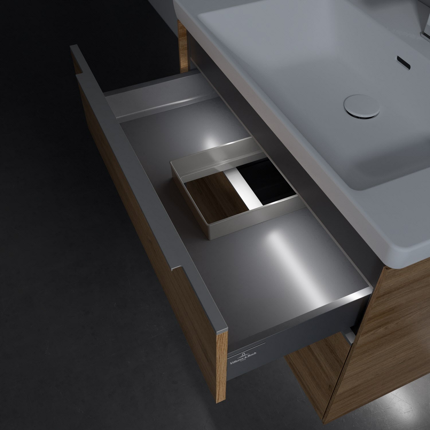 Der Waschtischunterschrank besticht durch gradliniges, zeitloses Design und großzügigen Stauraum. Eine voll ausziehbare Schublade mit rutschhemmendem Boden, Selbsteinzug-Funktion sowie zwei integrierten kleinen Accessory-Boxen bietet Platz für Pflege- und Hygieneartikel. Front und Korpus sind hochwertig verarbeitet. Die dezente Griffleiste sorgt für einfache Handhabung und bildet einen besonderen Design-Akzent.