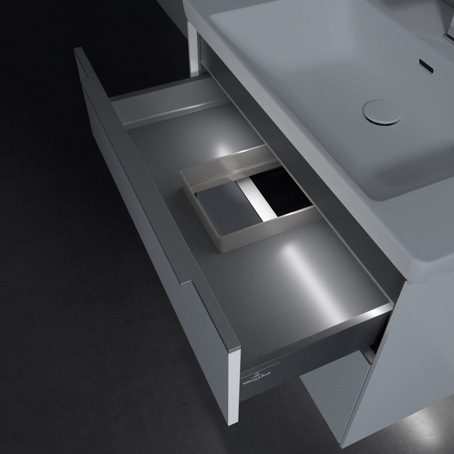 Der Waschtischunterschrank besticht durch gradliniges, zeitloses Design und großzügigen Stauraum. Eine voll ausziehbare Schublade mit rutschhemmendem Boden, Selbsteinzug-Funktion sowie zwei integrierten kleinen Accessory-Boxen bietet Platz für Pflege- und Hygieneartikel. Front und Korpus sind hochwertig verarbeitet. Die dezente Griffleiste sorgt für einfache Handhabung und bildet einen besonderen Design-Akzent.