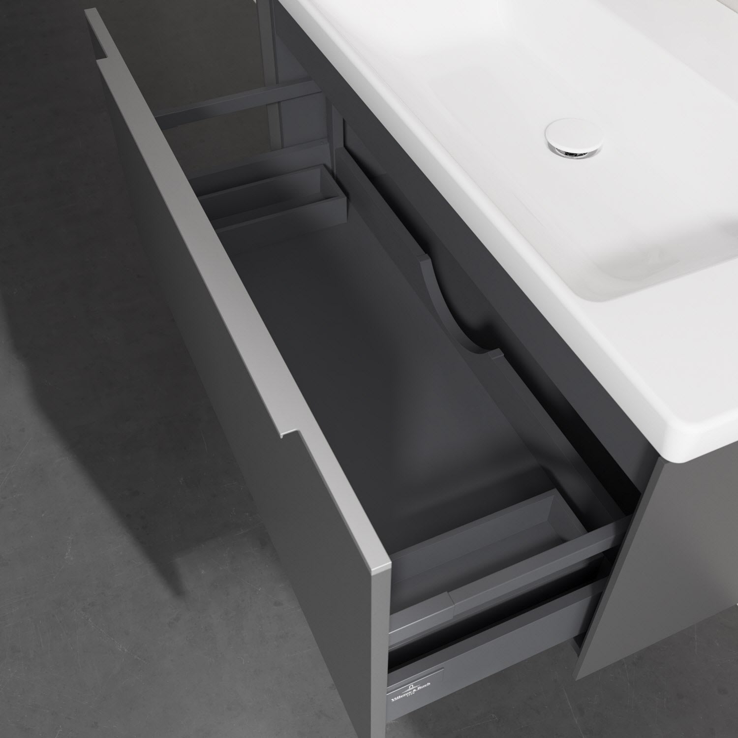 Der Waschtischunterschrank besticht durch gradliniges, zeitloses Design und großzügigen Stauraum. Eine voll ausziehbare Schublade mit rutschhemmendem Boden, Selbsteinzug-Funktion sowie zwei integrierten kleinen Accessory-Boxen bietet Platz für Pflege- und Hygieneartikel. Front und Korpus sind hochwertig verarbeitet. Die dezente Griffleiste sorgt für einfache Handhabung und bildet einen besonderen Design-Akzent.