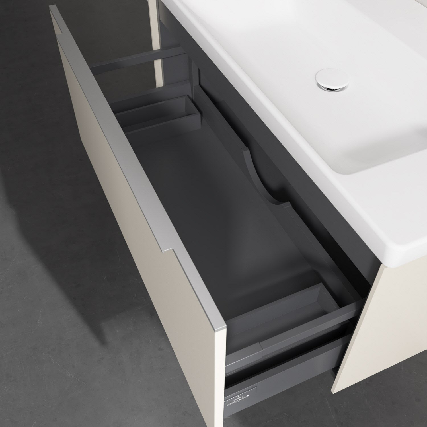 - kein Umfallen oder Verrutschen von Pflegeprodukten in den Schubladen dank rutschhemmendem Boden