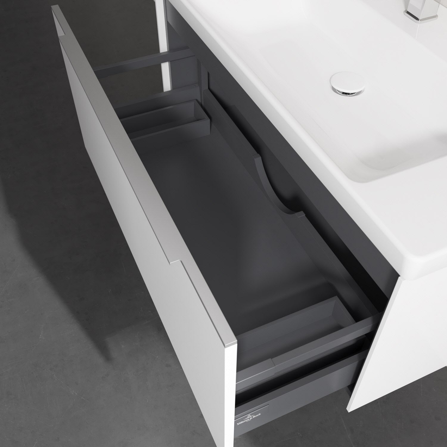 Der Waschtischunterschrank besticht durch gradliniges, zeitloses Design und großzügigen Stauraum. Eine voll ausziehbare Schublade mit rutschhemmendem Boden, Selbsteinzug-Funktion sowie zwei integrierten kleinen Accessory-Boxen bietet Platz für Pflege- und Hygieneartikel. Front und Korpus sind hochwertig verarbeitet. Die dezente Griffleiste sorgt für einfache Handhabung und bildet einen besonderen Design-Akzent.