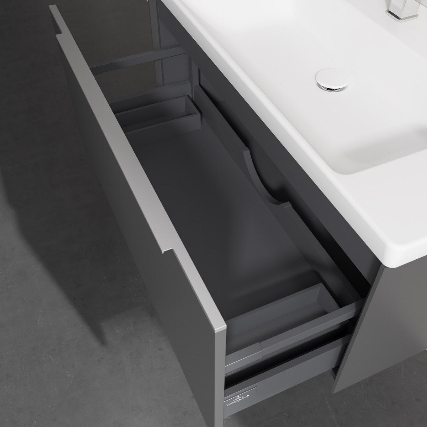 Der Waschtischunterschrank besticht durch gradliniges, zeitloses Design und großzügigen Stauraum. Eine voll ausziehbare Schublade mit rutschhemmendem Boden, Selbsteinzug-Funktion sowie zwei integrierten kleinen Accessory-Boxen bietet Platz für Pflege- und Hygieneartikel. Front und Korpus sind hochwertig verarbeitet. Die dezente Griffleiste sorgt für einfache Handhabung und bildet einen besonderen Design-Akzent.