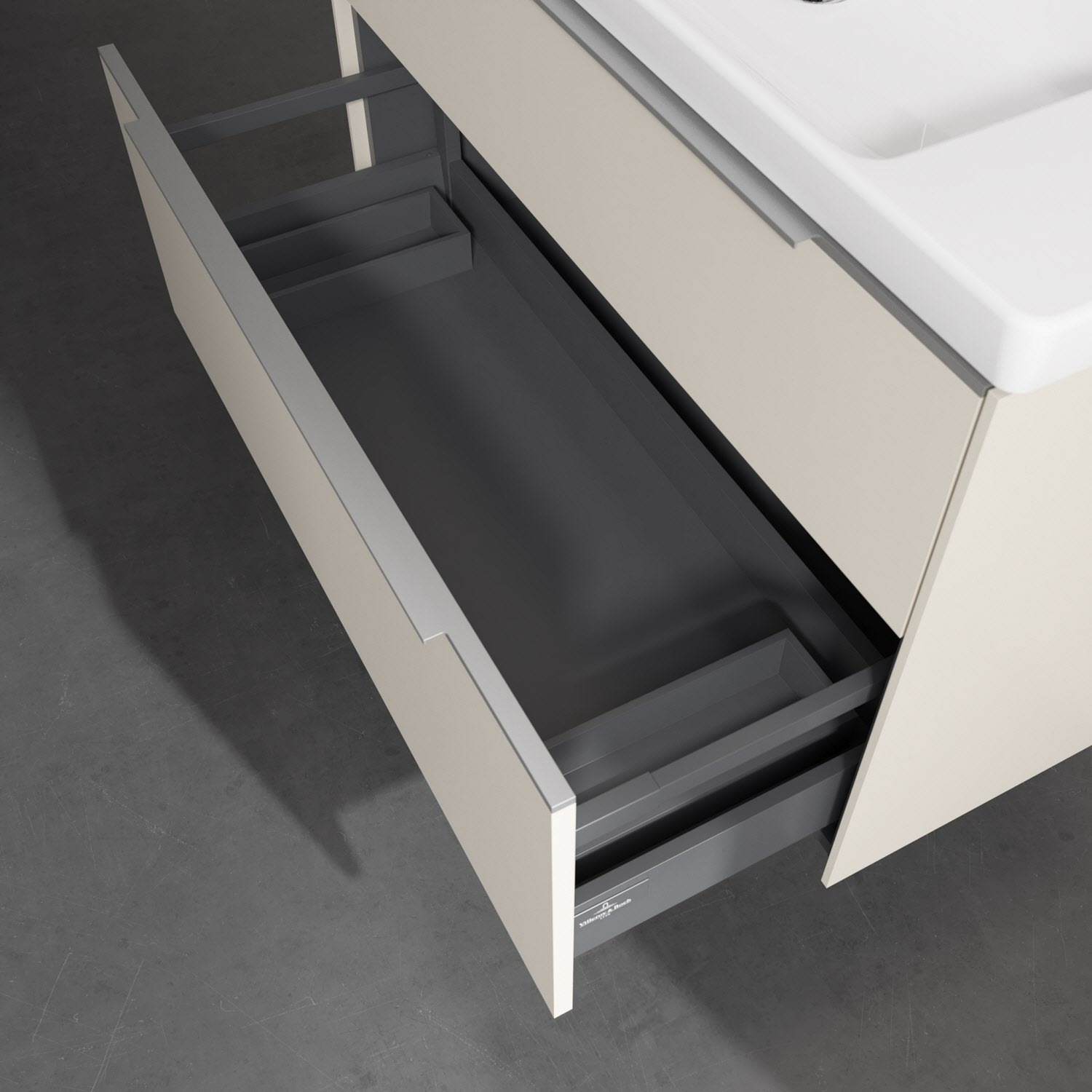 Der Waschtischunterschrank besticht durch gradliniges, zeitloses Design und großzügigen Stauraum. Eine voll ausziehbare Schublade mit rutschhemmendem Boden, Selbsteinzug-Funktion sowie zwei integrierten kleinen Accessory-Boxen bietet Platz für Pflege- und Hygieneartikel. Front und Korpus sind hochwertig verarbeitet. Die dezente Griffleiste sorgt für einfache Handhabung und bildet einen besonderen Design-Akzent.
