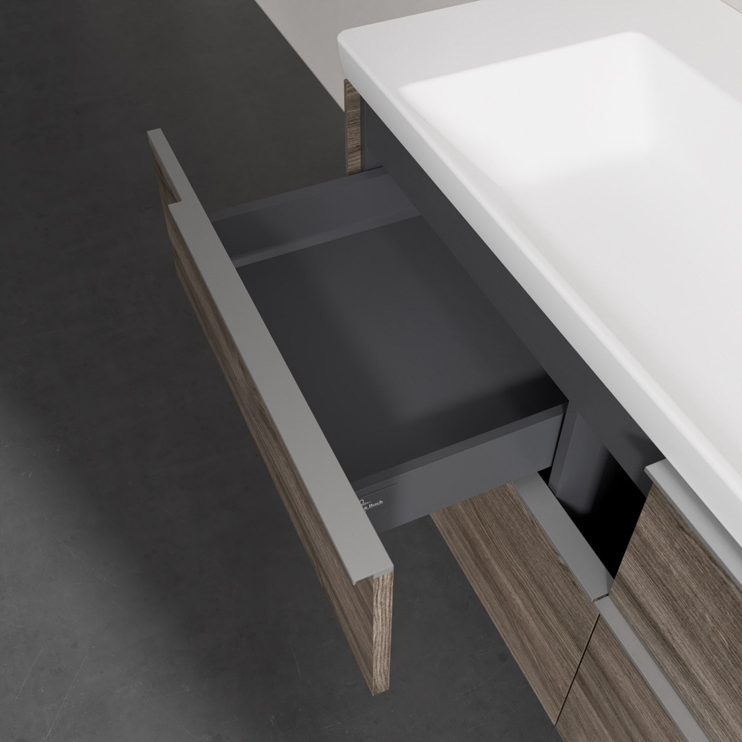 Der Waschtischunterschrank besticht durch gradliniges, zeitloses Design und großzügigen Stauraum. Voll ausziehbare Schubladen mit rutschhemmendem Boden, Selbsteinzug-Funktion sowie zwei integrierten kleinen Accessory-Boxen bieten Platz für Pflege- und Hygieneartikel. Front und Korpus sind hochwertig verarbeitet. Die dezente Griffleiste sorgt für einfache Handhabung und bildet einen besonderen Design-Akzent.