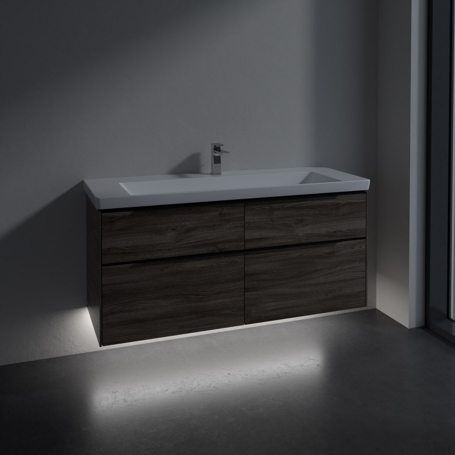 Der Waschtischunterschrank besticht durch gradliniges, zeitloses Design und großzügigen Stauraum. Voll ausziehbare Schubladen mit rutschhemmendem Boden, Selbsteinzug-Funktion sowie zwei integrierten kleinen Accessory-Boxen bieten Platz für Pflege- und Hygieneartikel. Front und Korpus sind hochwertig verarbeitet. Highlight ist die LED-Bodenbeleuchtung, die stimmungsvolles, sanftes Licht ins Bad bringt und nachts als Orientierungshilfe dient. Die dezente Griffleiste sorgt für einfache Handhabung und bildet einen besonderen Design-Akzent.
