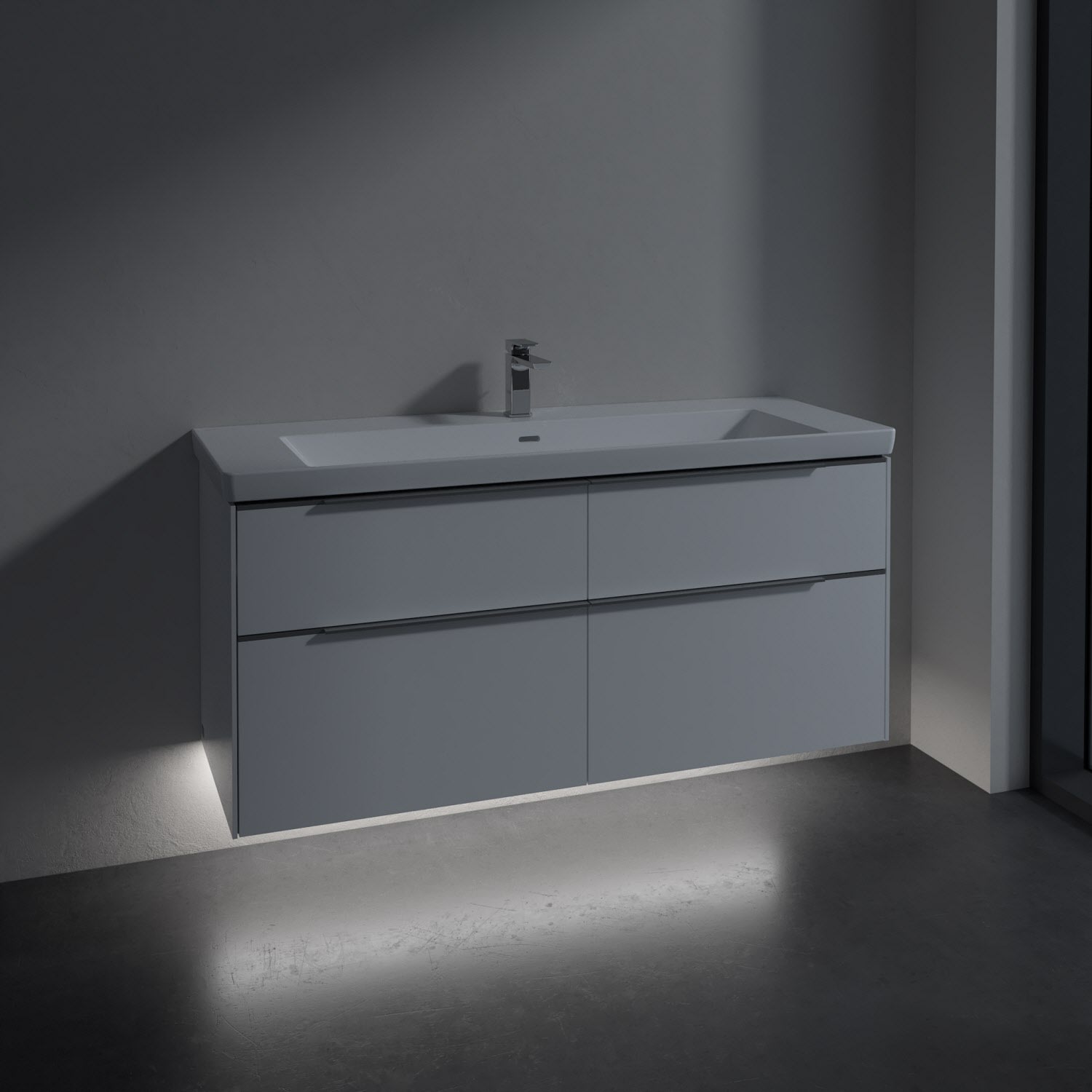 Der Waschtischunterschrank besticht durch gradliniges, zeitloses Design und großzügigen Stauraum. Voll ausziehbare Schubladen mit rutschhemmendem Boden, Selbsteinzug-Funktion sowie zwei integrierten kleinen Accessory-Boxen bieten Platz für Pflege- und Hygieneartikel. Front und Korpus sind hochwertig verarbeitet. Highlight ist die LED-Bodenbeleuchtung, die stimmungsvolles, sanftes Licht ins Bad bringt und nachts als Orientierungshilfe dient. Die dezente Griffleiste sorgt für einfache Handhabung und bildet einen besonderen Design-Akzent.