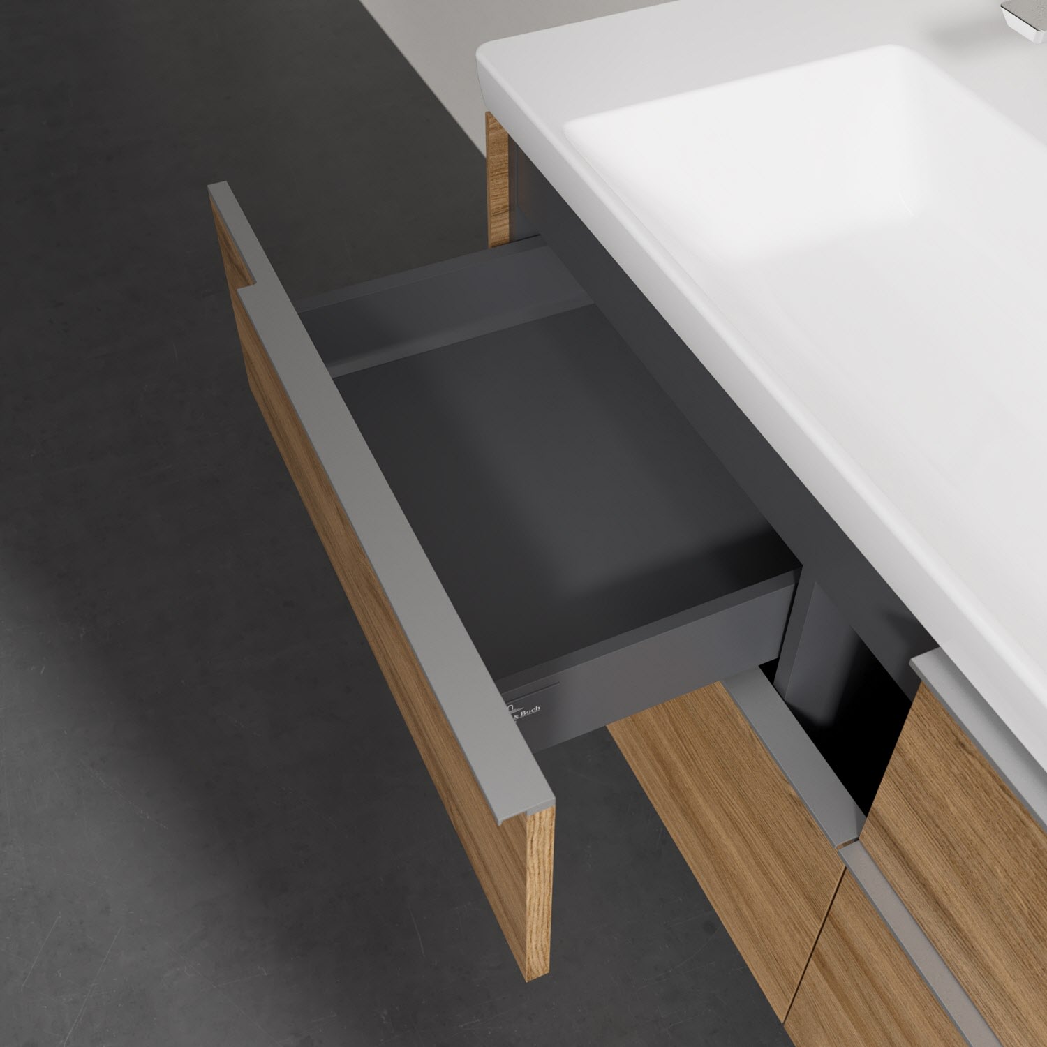 Der Waschtischunterschrank besticht durch gradliniges, zeitloses Design und großzügigen Stauraum. Voll ausziehbare Schubladen mit rutschhemmendem Boden, Selbsteinzug-Funktion sowie zwei integrierten kleinen Accessory-Boxen bieten Platz für Pflege- und Hygieneartikel. Front und Korpus sind hochwertig verarbeitet. Die dezente Griffleiste sorgt für einfache Handhabung und bildet einen besonderen Design-Akzent.