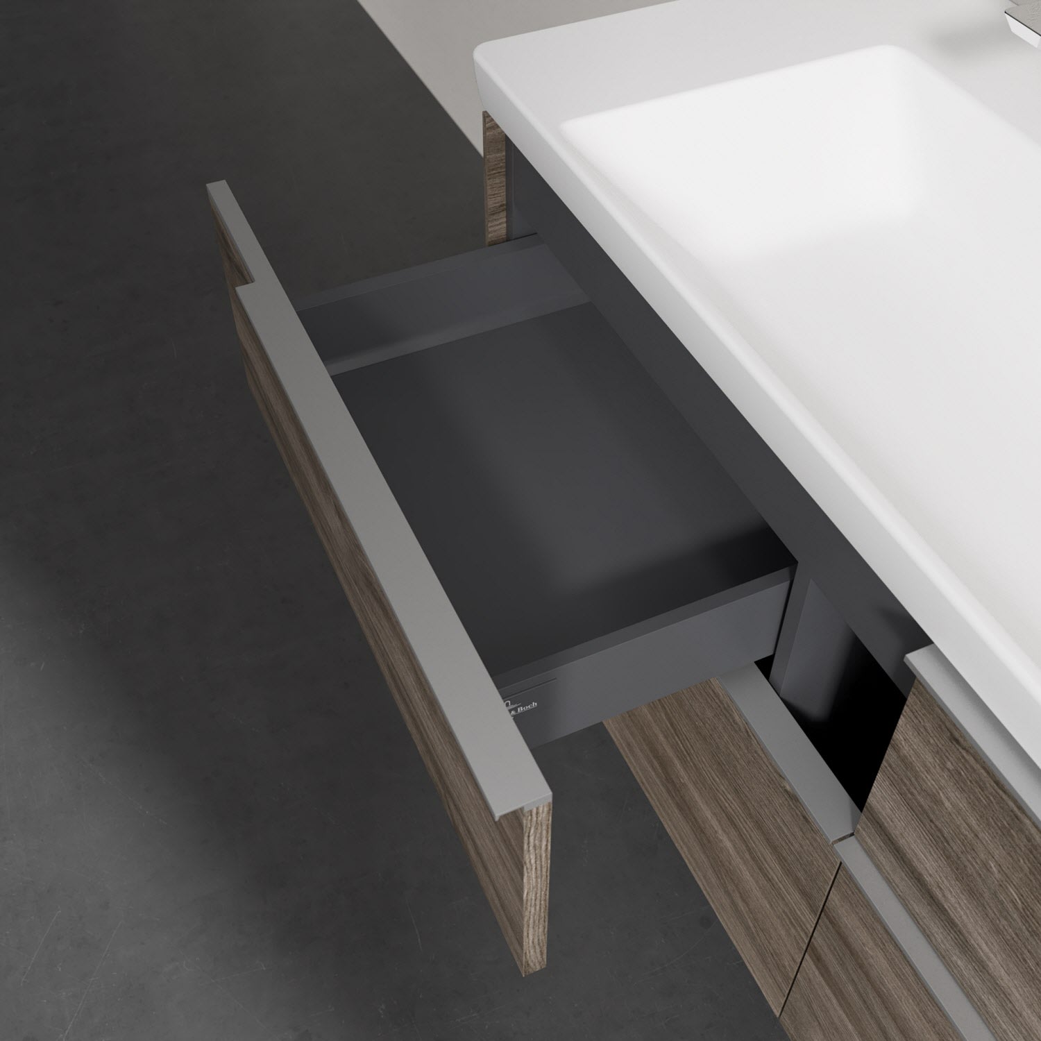 Der Waschtischunterschrank besticht durch gradliniges, zeitloses Design und großzügigen Stauraum. Voll ausziehbare Schubladen mit rutschhemmendem Boden, Selbsteinzug-Funktion sowie zwei integrierten kleinen Accessory-Boxen bieten Platz für Pflege- und Hygieneartikel. Front und Korpus sind hochwertig verarbeitet. Die dezente Griffleiste sorgt für einfache Handhabung und bildet einen besonderen Design-Akzent.