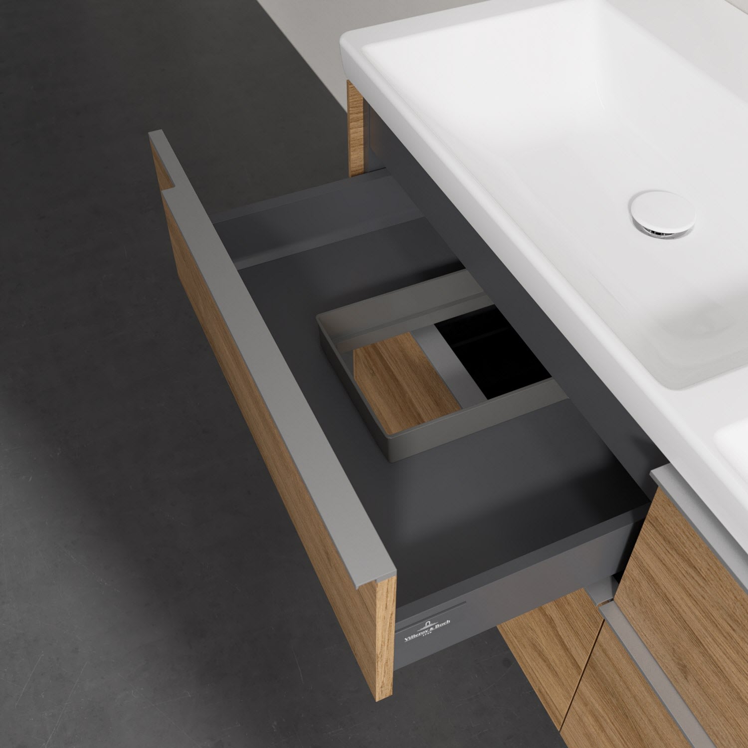 Der Waschtischunterschrank besticht durch gradliniges, zeitloses Design und großzügigen Stauraum. Voll ausziehbare Schubladen mit rutschhemmendem Boden, Selbsteinzug-Funktion sowie zwei integrierten kleinen Accessory-Boxen bieten Platz für Pflege- und Hygieneartikel. Front und Korpus sind hochwertig verarbeitet. Die dezente Griffleiste sorgt für einfache Handhabung und bildet einen besonderen Design-Akzent.