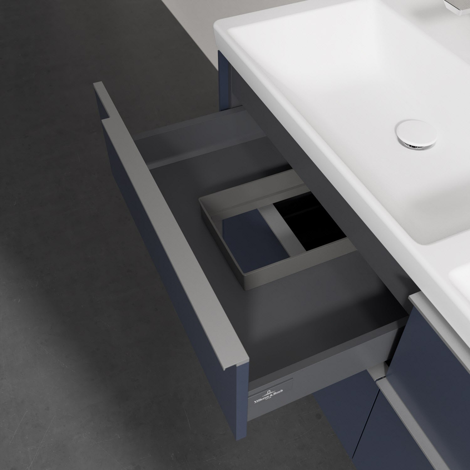 Der Waschtischunterschrank besticht durch gradliniges, zeitloses Design und großzügigen Stauraum. Voll ausziehbare Schubladen mit rutschhemmendem Boden, Selbsteinzug-Funktion sowie zwei integrierten kleinen Accessory-Boxen bieten Platz für Pflege- und Hygieneartikel. Front und Korpus sind hochwertig verarbeitet. Die dezente Griffleiste sorgt für einfache Handhabung und bildet einen besonderen Design-Akzent.