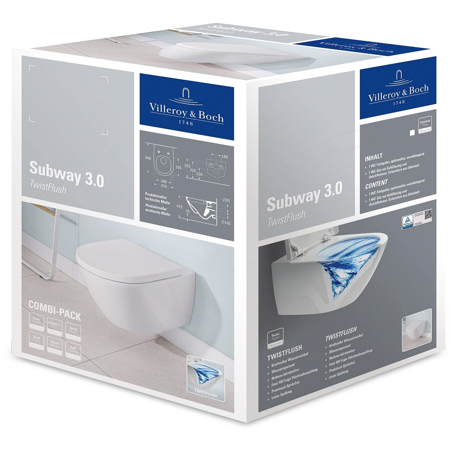 Das Komplett-Set besteht aus dem spülrandlosen WC und WC-Sitz der Bestseller-Kollektion Subway 3.0, dem Vorwandelement und der Betätigungsplatte ViConnect von Villeroy & Boch überzeugt mit seinem gewohnt zeitlosen Design und optimalem Spülergebnis. Denn die innovative Spültechnologie TwistFlush reinigt mit der physikalischen Kraft eines kontrolliert aufgebauten Wasserwirbels extrem hygienisch und sauber. Durch die Form des Innenbeckens, die keinerlei Ecken oder Kanten aufweist, wird die Schmutzanhaftung erschwert und die WC-Bürste nahezu überflüssig. So wird auch das Spülwasser viel effizienter genutzt, sodass 4,5 Liter für eine große und 3 Liter für eine kleine Spülung vollkommen ausreichen. Perfekt ergänzt wird das WC mit dem passenden ovalen WC-Sitz, der auch aus funktioneller Sicht punktet: Dank Absenkautomatik schließt der Deckel extrem leise und er ist für eine einfache und hygienische Reinigung schnell abnehmbar.
