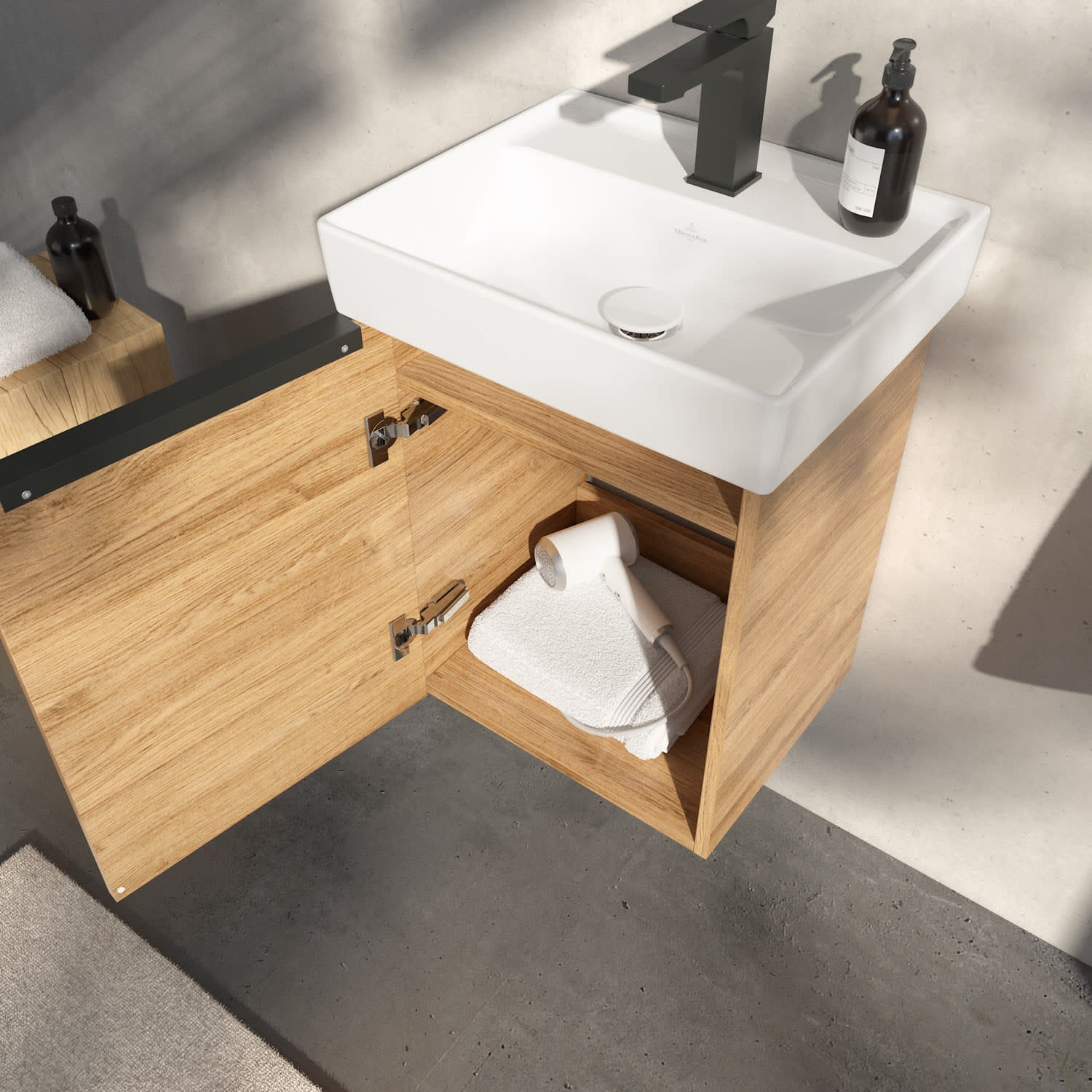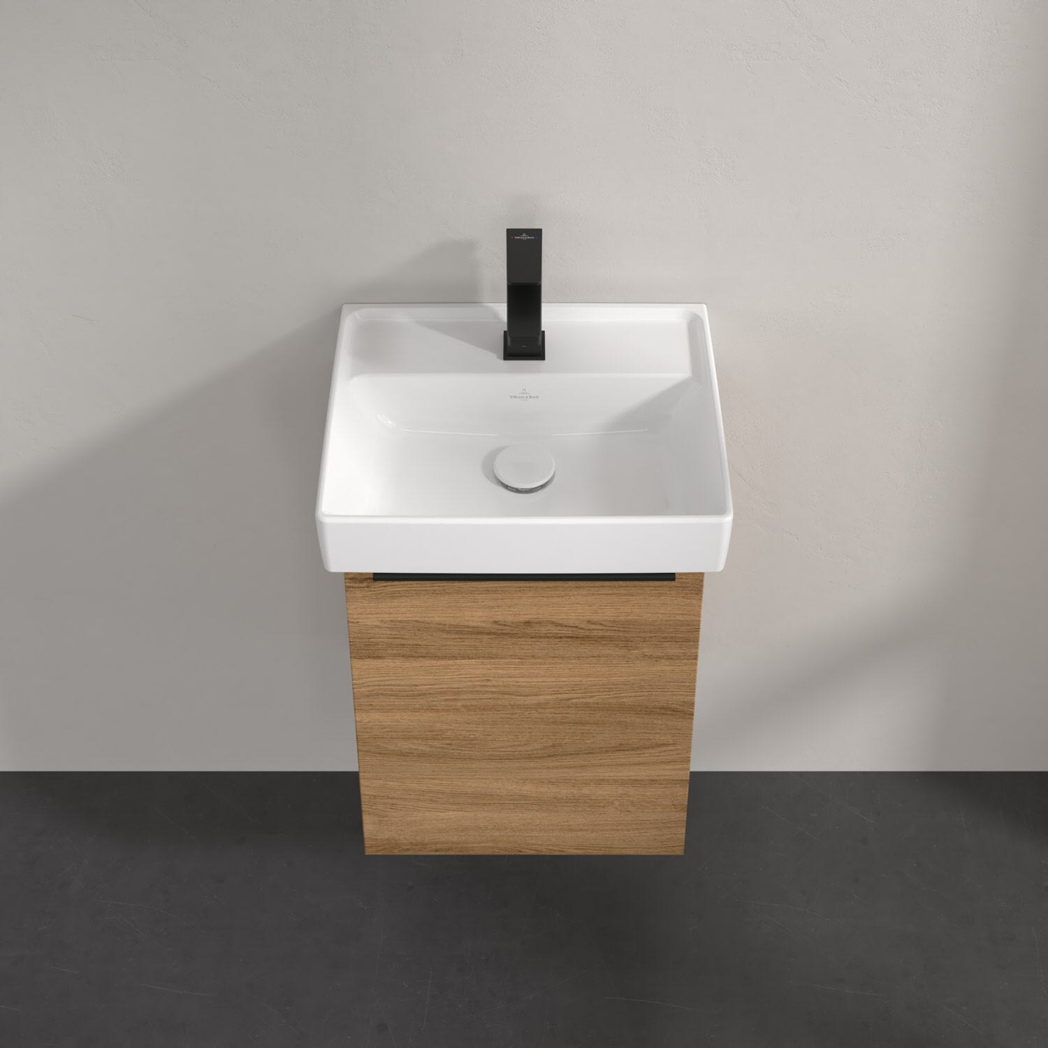 Kompakter Blickfang: Der Waschtischunterschrank von Villeroy & Boch aus der Kollektion Taro bringt Eleganz ins Bad. Highlight ist der edle Aufsatzgriff, der nicht nur funktional und haptisch angenehm ist, sondern auch einen stilvollen Akzent zu den modernen Fronten setzt. Der kompakte Unterschrank bietet erstaunlich viel Stauraum für Bad-Accessoires und Handtücher – ideal auch für kleine Bäder. Die Tür mit integrierter Dämpfung schließt leise und sanft, die pflegeleichten Oberflächen machen die Reinigung besonders einfach. Er passt perfekt zu den filigranen Keramik-Waschbecken der Kollektion Taro und rundet das Baddesign gekonnt ab.