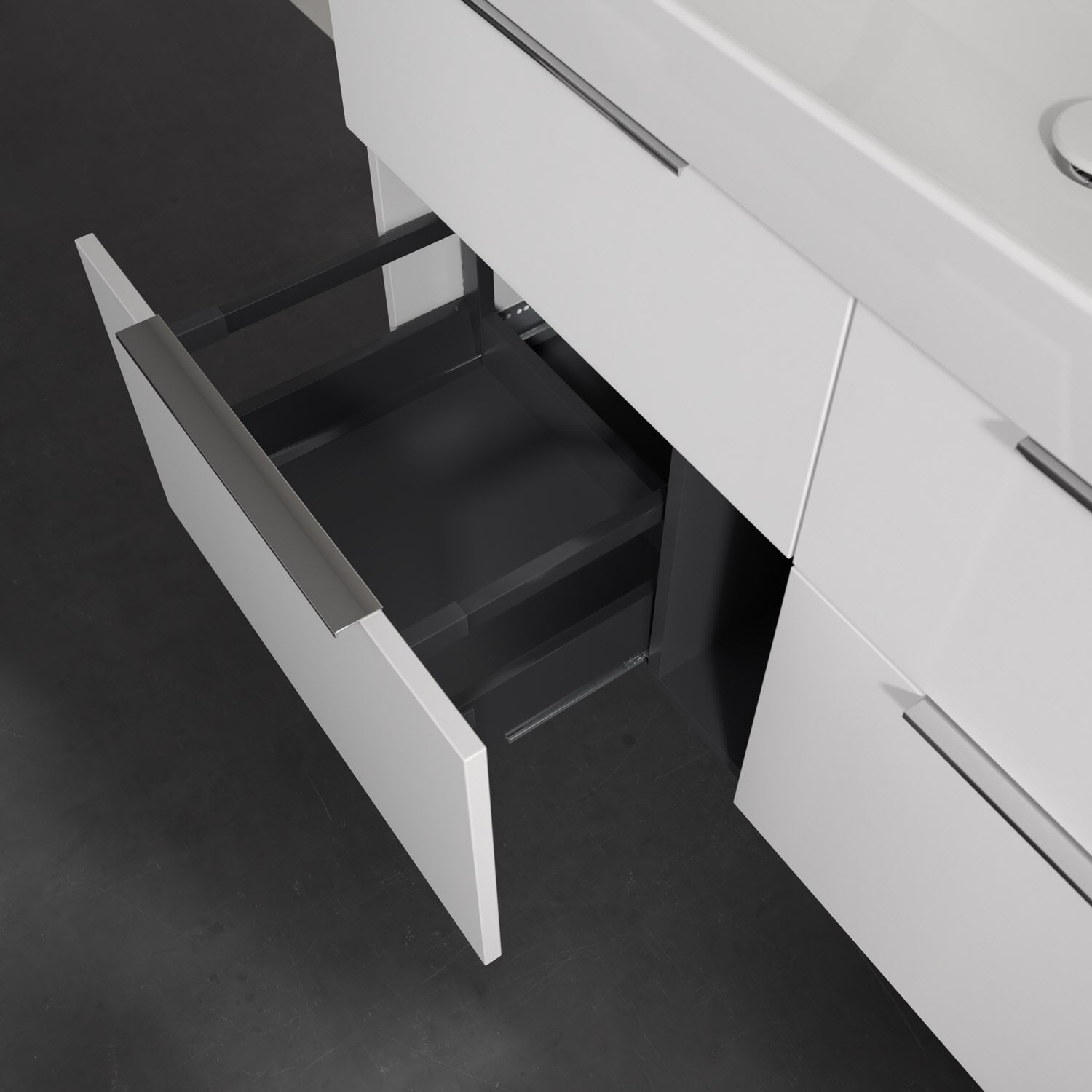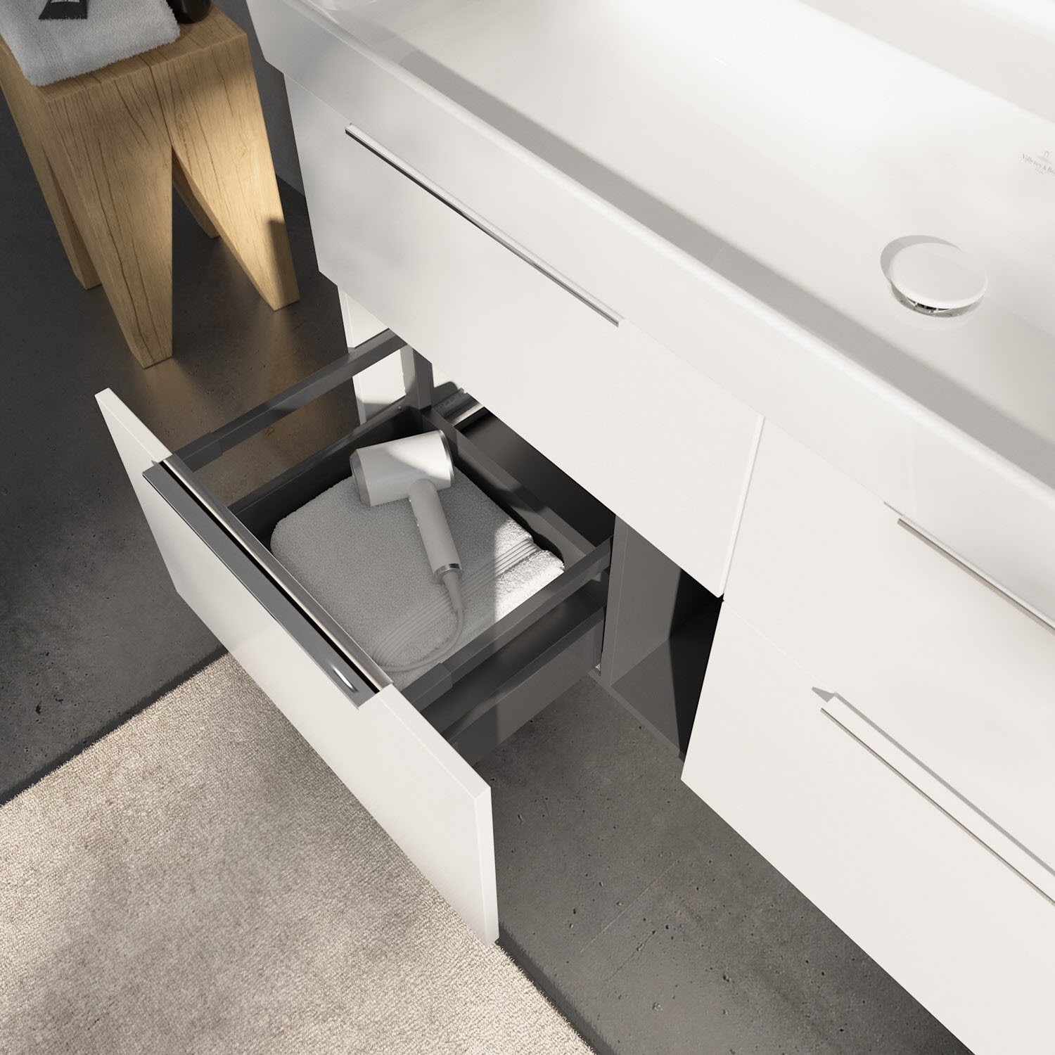 Stauraumwunder in modernem Design: Der Villeroy & Boch Waschtischunterschrank aus der Kollektion Taro eignet sich besonders für Familienbäder und bietet genau den Platz, der dort benötigt wird. Edle, mittig platzierte Aufsatzgriffe setzen stilvolle Akzente und ergänzen stimmig die moderne, pflegeleichte Front. Mit vier Vollauszügen bietet der Unterschrank beeindruckend viel Stauraum für alle Badutensilien und Accessoires. Durch das großzügige Platzangebot und den integrierten Anti-Rutsch-Boden bleiben die Utensilien beim Öffnen und Schließen sicher an ihrem Platz. Der praktische Selbsteinzug verhindert ein lautes Zuschlagen der Schubladen. Unser Tipp: Ergänzen Sie das großzügige Möbel mit einem hochwertigen Taro Keramik-Waschbecken – für die perfekte Kombination aus Funktion und Design!