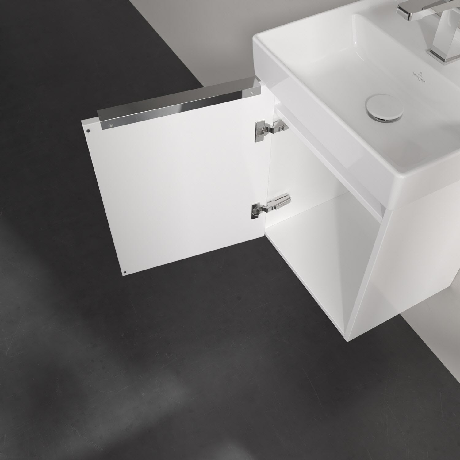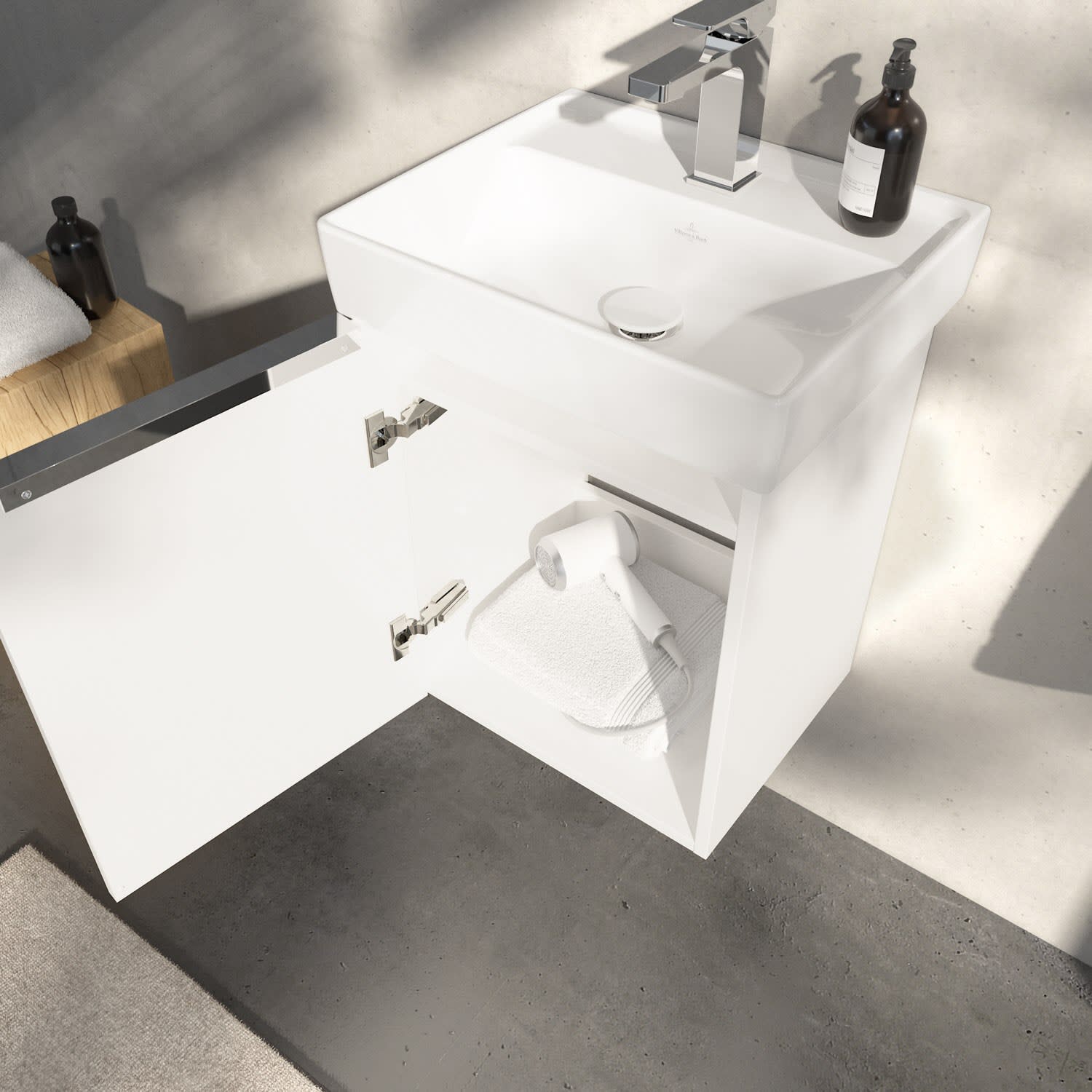 Kompakter Blickfang: Der Waschtischunterschrank von Villeroy & Boch aus der Kollektion Taro bringt Eleganz ins Bad. Highlight ist der edle Aufsatzgriff, der nicht nur funktional und haptisch angenehm ist, sondern auch einen stilvollen Akzent zu den modernen Fronten setzt. Der kompakte Unterschrank bietet erstaunlich viel Stauraum für Bad-Accessoires und Handtücher – ideal auch für kleine Bäder. Die Tür mit integrierter Dämpfung schließt leise und sanft, die pflegeleichten Oberflächen machen die Reinigung besonders einfach. Er passt perfekt zum filigranen Taro Handwaschbecken mit zeitgemäßem Design und feinen Linien. Mit seinen kompakten Maßen passt es prima in kleine Gästebäder ohne dabei an Komfort einzubüßen. Auf der Hahnlochbank können problemlos Seifenschale oder -spender platziert werden und die umlaufende Abstufung verhindert das Runtertropfen von Wasserspritzern. Zu einer leichten Reinigung trägt die schmutzabweisende Oberfläche bei.
