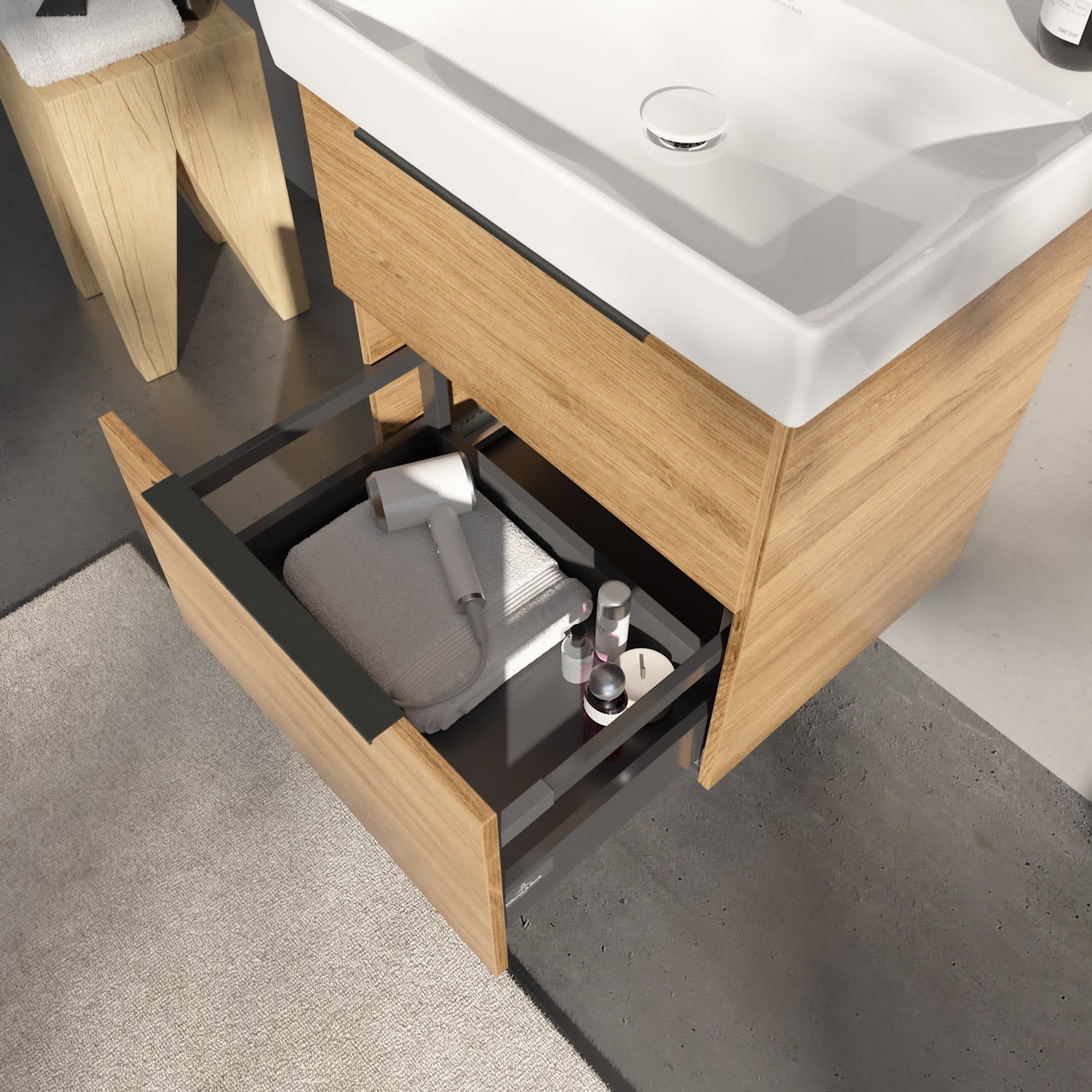 Der Villeroy & Boch Waschtischunterschrank der Kollektion Taro setzt stilvolle Akzente im Bad. Die eleganten Aufsatzgriffe bilden einen schönen Kontrast zu den modernen, pflegeleichten Fronten des Möbelstücks. Der kompakte Waschtischunterschrank bietet mit zwei Auszügen erstaunlich viel Stauraum: Hier lassen sich die wichtigsten Utensilien direkt unter dem Waschtisch verstauen. Die Auszüge mit Selbsteinzug gleiten sanft und leise. Der integrierte Anti-Rutsch-Boden sorgt dafür, dass die Utensilien sicher an ihrem Platz bleiben. Er passt perfekt zum Wandwaschbecken der Kollektion Taro – schick, funktional und glänzt mit besten Keramikeigenschaften. Besonders dünne Wandstärken bringen Leichtigkeit ins Badezimmer, während die umlaufenden Kante als Spritz- und Kippschutz dient. So können auf den breiten Hahnlochbank problemlos Zahnputzbecher oder Seifenspender platziert werden. Veredelt mit der schmutzabweisenden Beschichtung ist die Pflege und Reinigung ein Kinderspiel.