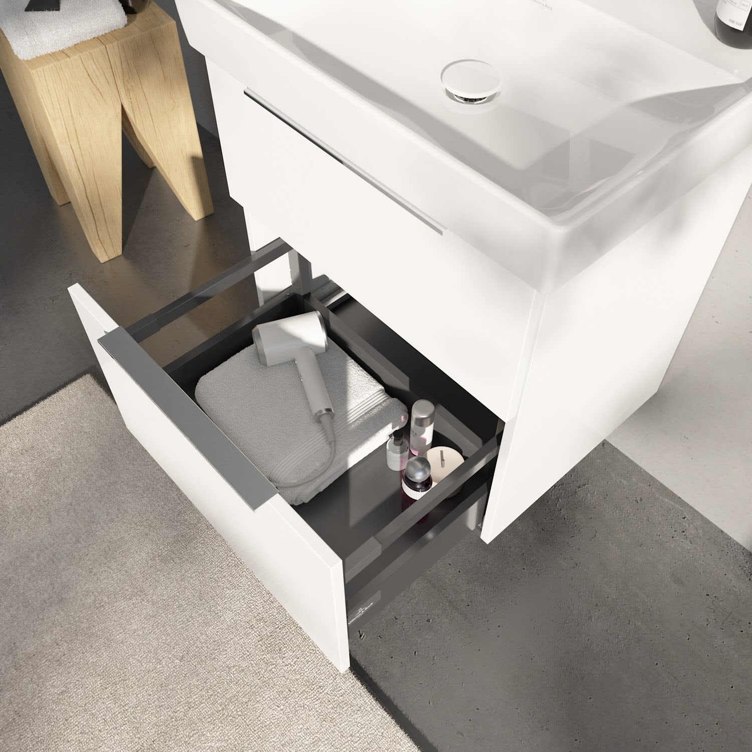 Der Villeroy & Boch Waschtischunterschrank der Kollektion Taro setzt stilvolle Akzente im Bad. Die eleganten Aufsatzgriffe bilden einen schönen Kontrast zu den modernen, pflegeleichten Fronten des Möbelstücks. Der kompakte Waschtischunterschrank bietet mit zwei Auszügen erstaunlich viel Stauraum: Hier lassen sich die wichtigsten Utensilien direkt unter dem Waschtisch verstauen. Die Auszüge mit Selbsteinzug gleiten sanft und leise. Der integrierte Anti-Rutsch-Boden sorgt dafür, dass die Utensilien sicher an ihrem Platz bleiben. Er passt perfekt zum Wandwaschbecken der Kollektion Taro – schick, funktional und glänzt mit besten Keramikeigenschaften. Besonders dünne Wandstärken bringen Leichtigkeit ins Badezimmer, während die umlaufenden Kante als Spritz- und Kippschutz dient. So können auf den breiten Hahnlochbank problemlos Zahnputzbecher oder Seifenspender platziert werden. Veredelt mit der schmutzabweisenden Beschichtung ist die Pflege und Reinigung ein Kinderspiel.
