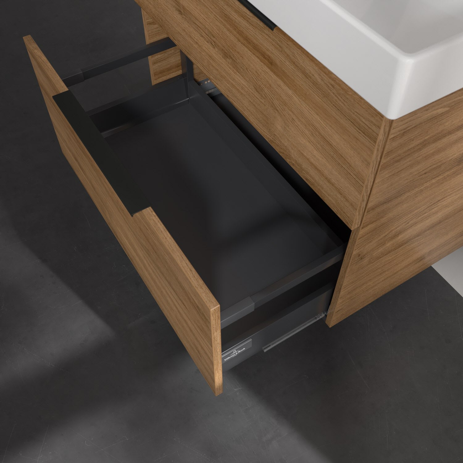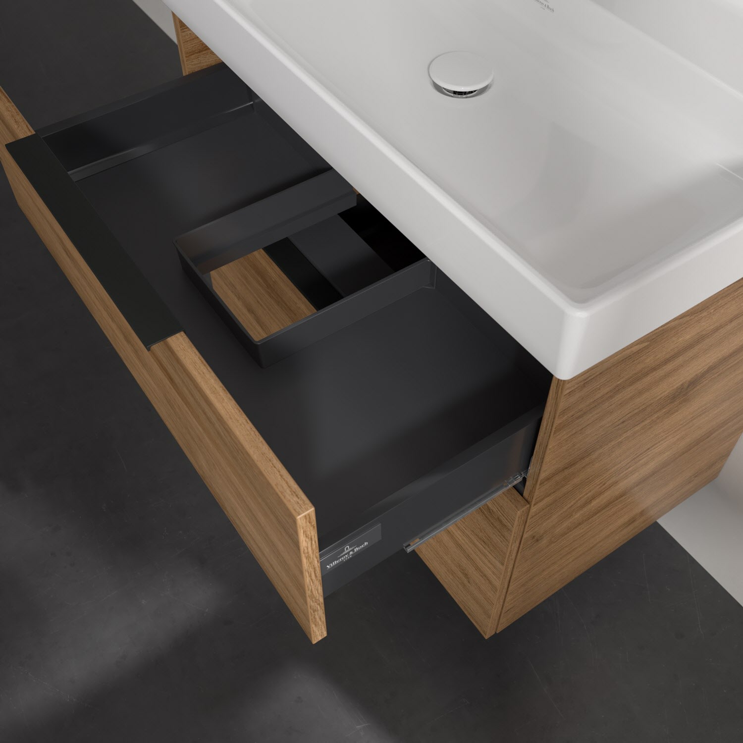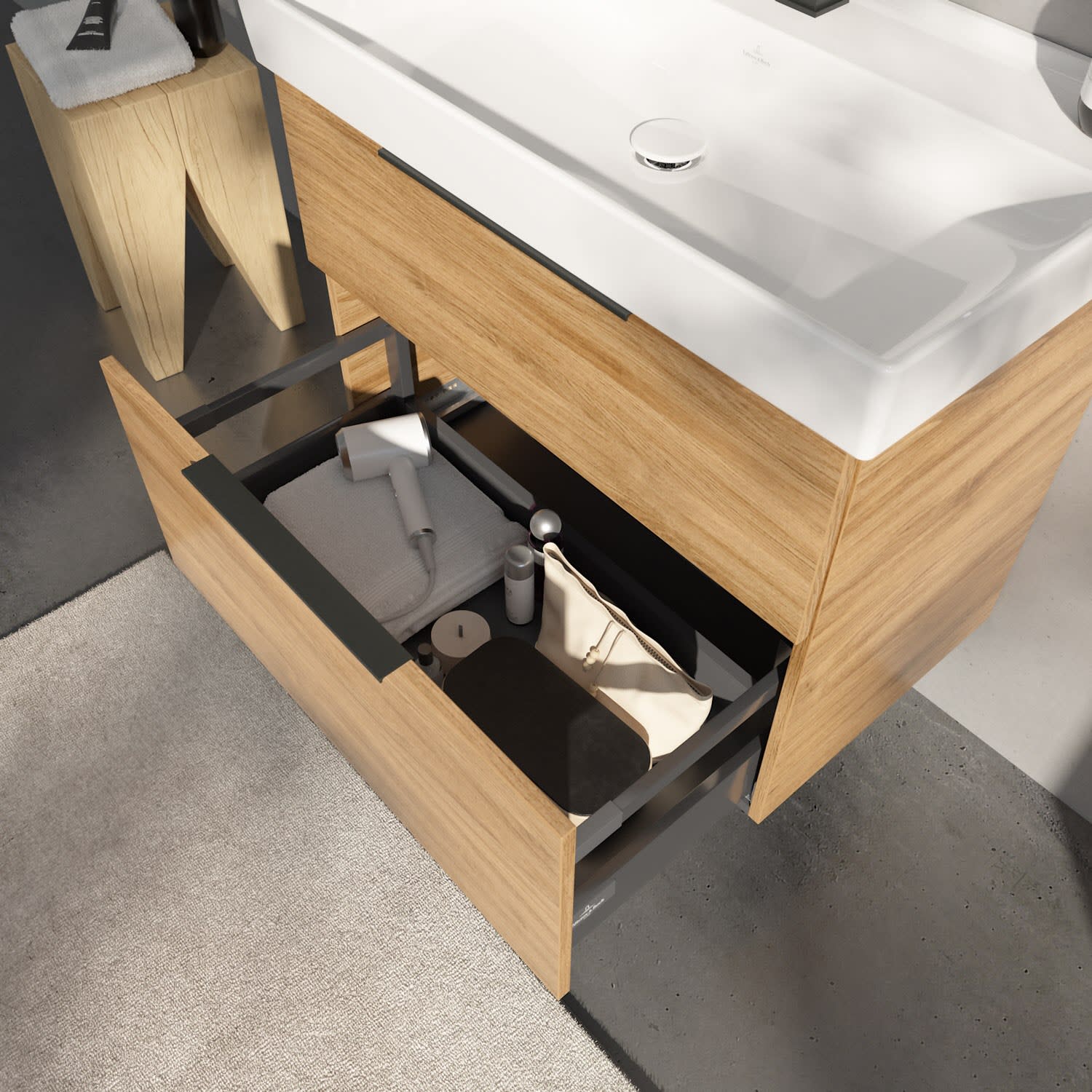Der Waschtischunterschrank der Kollektion Taro von Villeroy & Boch bringt Komfort und Eleganz ins Bad. Highlight ist der edle, mittig platzierte Griff, der einen stilvollen Akzent setzt und die moderne, pflegeleichte Front harmonisch ergänzt. Mit zwei Auszügen und großzügigem Platzangebot bietet das Möbel Komfort und Stauraum im Inneren – von Bad-Accessoires über Föhn bis hin zu Handtüchern ist alles direkt am Waschplatz verstaut. Die Auszüge mit Selbsteinzug schließen sanft und leise, während der integrierte Anti-Rutsch-Boden dafür sorgt, dass die Utensilien sicher an ihrem Platz bleiben. Stilvoll und designstark zeigt sich der dazu passende, rechteckige Taro Schrankwaschtisch. Seine feine Optik erhält er durch die extrem dünne aber besonders widerstandsfähige Wandstärke. Die schmalen Ränder dienen gleichzeitig als Spritzschutz und vermeiden unerwünschte Wasserflecken auf dem Boden. Auf der großzügigen Hahnlochbank findet sich ausreichend Fläche für Zahnputzbecher und Co. Praktisch! Die Pflege und Reinigung der schmutzabweisenden Keramikoberfläche geht besonders leicht von der Hand.