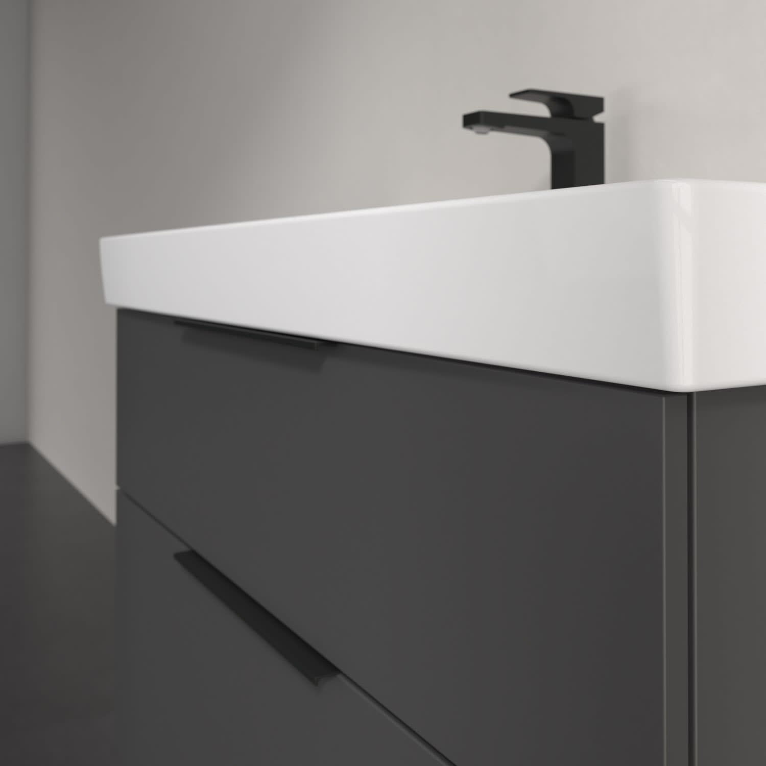 Der Waschtischunterschrank der Kollektion Taro von Villeroy & Boch bringt Komfort und Eleganz ins Bad. Highlight ist der edle, mittig platzierte Griff, der einen stilvollen Akzent setzt und die moderne, pflegeleichte Front harmonisch ergänzt. Mit zwei Auszügen und großzügigem Platzangebot bietet das Möbel Komfort und Stauraum im Inneren – von Bad-Accessoires über Föhn bis hin zu Handtüchern ist alles direkt am Waschplatz verstaut. Die Auszüge mit Selbsteinzug schließen sanft und leise, während der integrierte Anti-Rutsch-Boden dafür sorgt, dass die Utensilien sicher an ihrem Platz bleiben. Stilvoll und designstark zeigt sich der dazu passende, rechteckige Taro Schrankwaschtisch. Seine feine Optik erhält er durch die extrem dünne aber besonders widerstandsfähige Wandstärke. Die schmalen Ränder dienen gleichzeitig als Spritzschutz und vermeiden unerwünschte Wasserflecken auf dem Boden. Auf der großzügigen Hahnlochbank findet sich ausreichend Fläche für Zahnputzbecher und Co. Praktisch! Die Pflege und Reinigung der schmutzabweisenden Keramikoberfläche geht besonders leicht von der Hand.