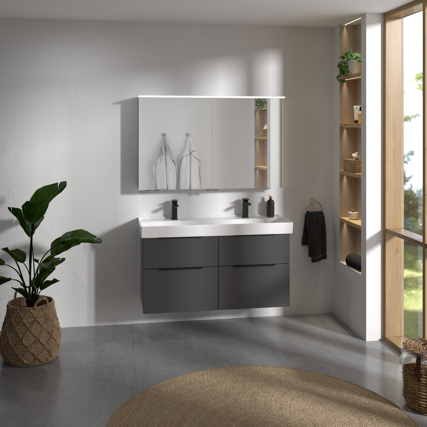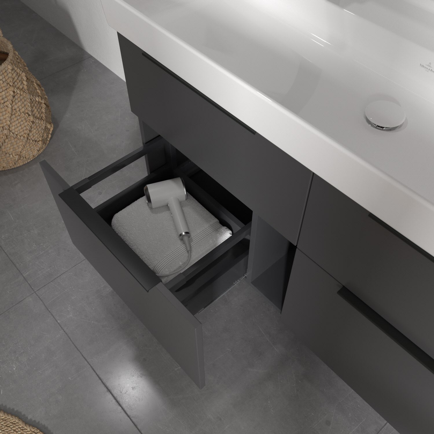 Stauraumwunder in modernem Design: Der Villeroy & Boch Waschtischunterschrank aus der Kollektion Taro eignet sich besonders für Familienbäder und bietet genau den Platz, der dort benötigt wird. Edle, mittig platzierte Aufsatzgriffe setzen stilvolle Akzente und ergänzen stimmig die moderne, pflegeleichte Front. Mit vier Vollauszügen bietet der Unterschrank beeindruckend viel Stauraum für alle Badutensilien und Accessoires. Durch das großzügige Platzangebot und den integrierten Anti-Rutsch-Boden bleiben die Utensilien beim Öffnen und Schließen sicher an ihrem Platz. Der praktische Selbsteinzug verhindert ein lautes Zuschlagen der Schubladen. Stilvoll und designstark zeigt sich der dazu passende, rechteckige Taro Schrankwaschtisch im Familienbad. Seine feine Optik erhält er durch die extrem dünne aber besonders widerstandsfähige Wandstärke. Die schmalen Ränder dienen gleichzeitig als Spritzschutz und vermeiden unerwünschte Wasserflecken auf dem Boden. Auf der großzügigen Hahnlochbank findet sich neben Platz für zwei Armaturen auch ausreichend Fläche für Zahnputzbecher und Co. Die Pflege und Reinigung der schmutzabweisenden Keramikoberfläche geht besonders leicht von der Hand.